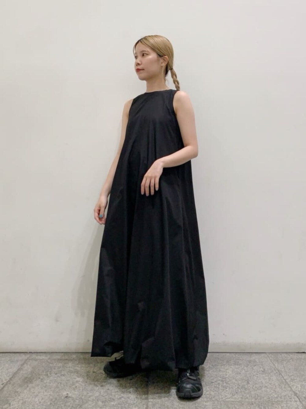 【スタイリングポイント】一見シンプルに見えますが、程良いアメスリ、裾のバルーン等、細部でデザイン性のあるワンピースです。背中にはザックリ大きめのスリットがあり、少し肌見せする事で抜け感が出ます。気になる方はピタッとしたインナーを着て頂ければ着やすいです。ビーチサンダルやトレンドのリカバリーサンダルはもちろんのこと、敢えてゴツめのスニーカー合わせも個人的にかわいいと思います。 ------------------------- 身長:159cm 【普段サイズ】・トップス:M・ボトムス:M・シューズ:23.0/ * 【着用サイズ】・ワンピース:M -------------------------