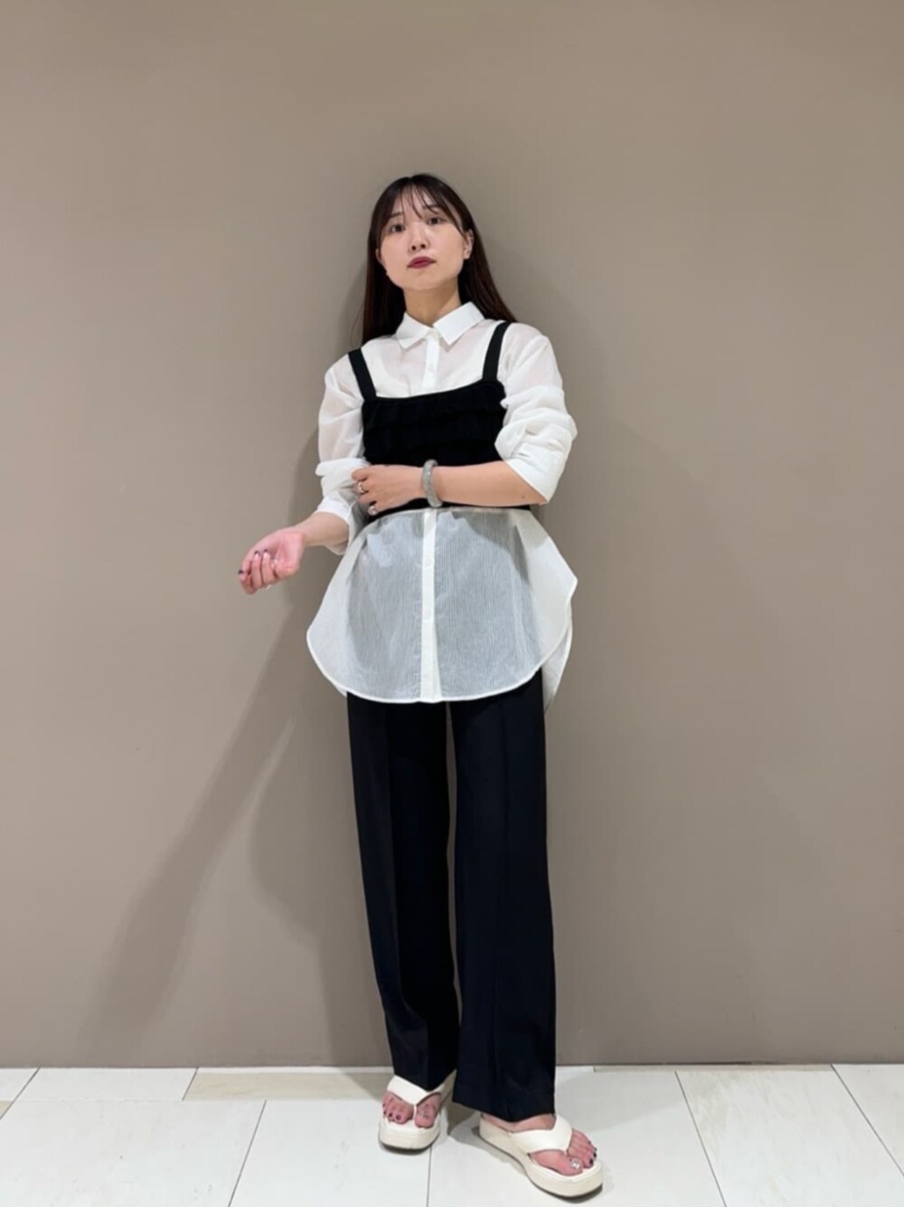 シアーストライプシャツ・・・程よく透け感があり夏でもサラッと羽織っていただけるシャツはインナーにも着ていただける素材感と薄さです!万能なシャツなので1枚持っているととても便利です♡ 麻混パンツ・・・スッキリとしたシルエットながらにゆったり感もありとても履きやすいパンツです!センタープレスが入っているので見た目からもスッキリ感がわかりON/OFF兼用でもお使いいただけます! ニットビスチェ・・・ニット素材でできているニットビスチェはシャツ合わせやTシャツ合わせでも可愛くこなれ感を出すことができる優れものです☺︎サイズ感は体に沿うタイトなサイズなのでコーデにメリハリを付けられるのもオススメポイントです!♪ ------------------------- 身長:163cm 【普段サイズ】・トップス:M・ボトムス:M・シューズ:24.5/ L 【着用サイズ】・トップス:M・ボトムス:M・シューズ:24.5/ L -------------------------