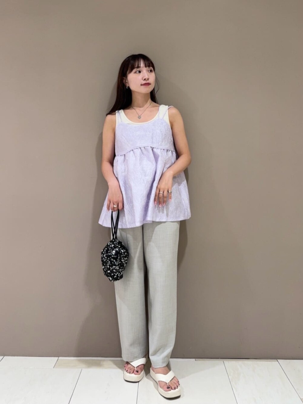 ジャガードキャミビスチェ・・・ふんわり広がるシルエットが女性らしいキャミビスチェです♡光沢のあるジャガードの生地もオシャレポイント!インナーにTシャツや秋になったら長袖のシアーインナーとか入れても可愛く着れます☺︎ ウエストイージーパンツ・・・ゆったりとしたシルエットでサラッとしているので夏でも快適に履いていただけます!Mサイズ着用で画像のシルエットですが、ウエストにゴムが入っているのとリボンも付いているのでので長さも多少調節できます☺︎シンプルにTシャツと合わせてリラックススタイルにもおすすめです♪ ------------------------- 身長:163cm 【普段サイズ】 ・トップス:M ・ボトムス:M ・シューズ:24.5/ L 【着用サイズ】 ・トップス:M ・ボトムス:M ・シューズ:24.5/ L