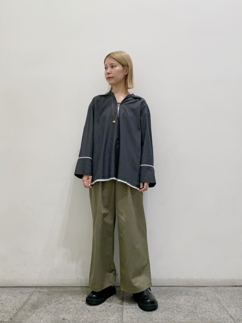 敢えてアウトスタイルのリラックススタイルです。グレー×カーキが一見メンズライクですが、スキッパーデザイン効果で女性らしさが出ます。更に華奢なゴールドネックレスでレディな雰囲気を出しました。パンツは156cm、Sサイズ着用、くるぶしが隠れるくらいの着丈でスッキリと着用できました。 ------------------------- 身長:156cm 【普段サイズ】トップス:M・ボトムス:M・シューズ:23.0 【着用サイズ】トップス:M・ボトムス:S・シューズ:23.0 -------------------------