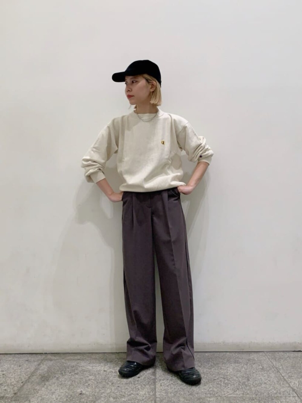 N.の店頭で展開されている、championのスウェットをメインにスタイリングしました。スポーティーにトラックパンツを合わせました。N.のトラックパンツはきれいめ見えするので、大人な女性にも挑戦して頂きやすいです。CAPは秋らしくベロア素材を取り入れ、先取り感を出しました。バックリボンになっていますが、写真のように垂らすと甘さが抜けて、そちらもまた楽しめます。 ------------------------- 身長:156cm 【普段サイズ】トップス:M・ボトムス:M・シューズ:23.0 【着用サイズ】トップス:M・ボトムス:M・シューズ:23.0 -------------------------