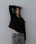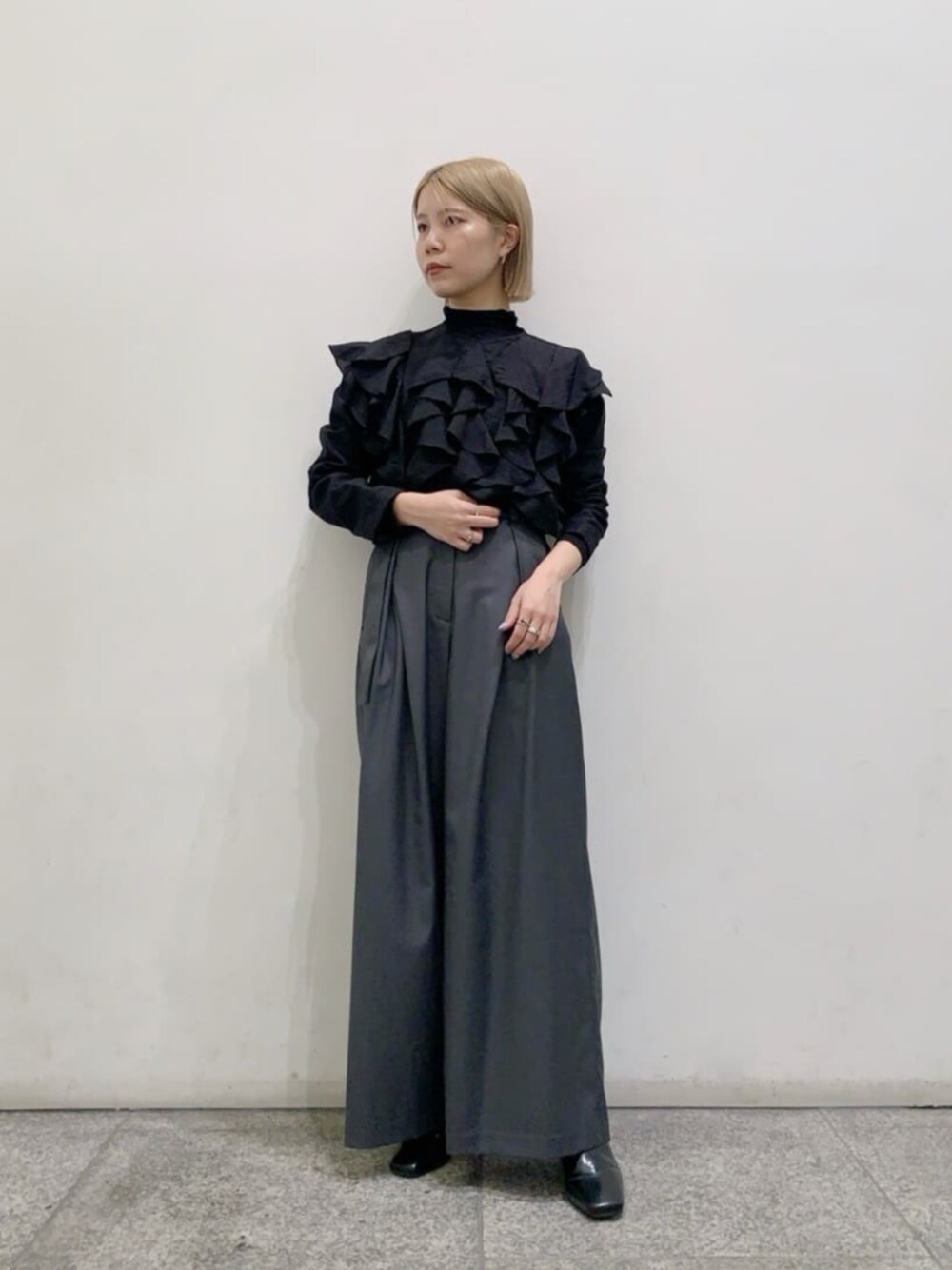 全面のラッフルデザインが一枚で着映えるデザインです。もちろん一枚で着るのも綺麗ですが、インナーを仕込みモードな印象に仕上げました。少し甘めなデザインなので、ボトムスは敢えてクールなワイドパンツでバランスを取りました。 ------------------------- 身長:156cm 【普段サイズ】トップス:M・ボトムス:M・シューズ:23.0 【着用サイズ】トップス:M・ボトムス:M・シューズ:23.5 -------------------------