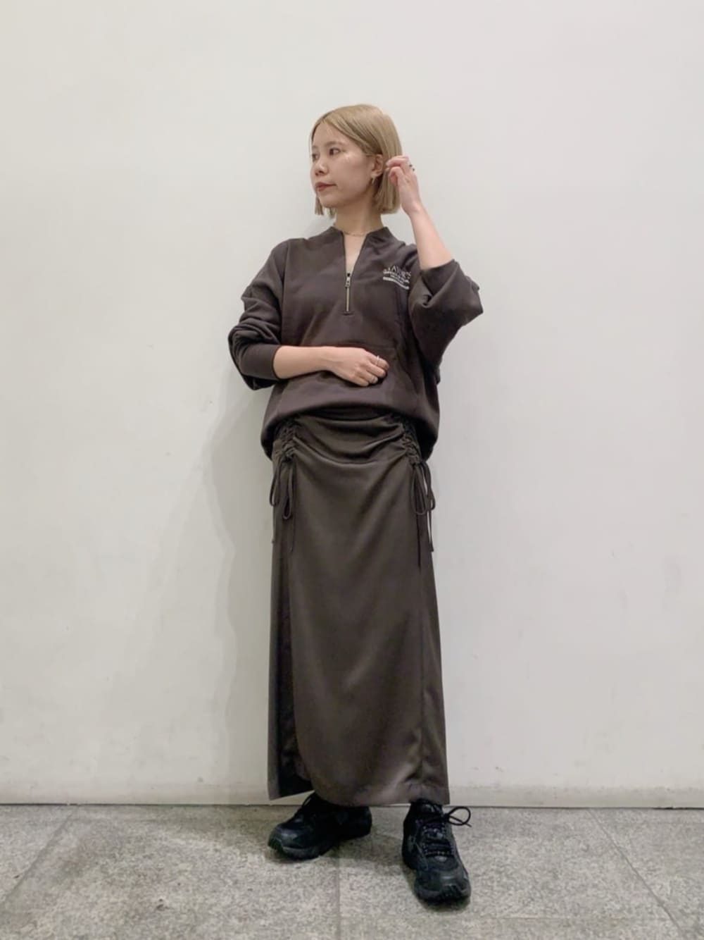 敢えてグレーのワントーンで抜け感を出してみました。スカートはドロストデザインがポイントで、サテンライクな素材感なので大人見えします。スウェットはN.の店頭で展開しているGOOD ROCK SPEEDのセレクトです。バックプリントロゴがポイントです。 ------------------------- 身長:156cm 【普段サイズ】トップス:M・ボトムス:M・シューズ:23.0 【着用サイズ】トップス:M・ボトムス:M・シューズ:23.0 -------------------------