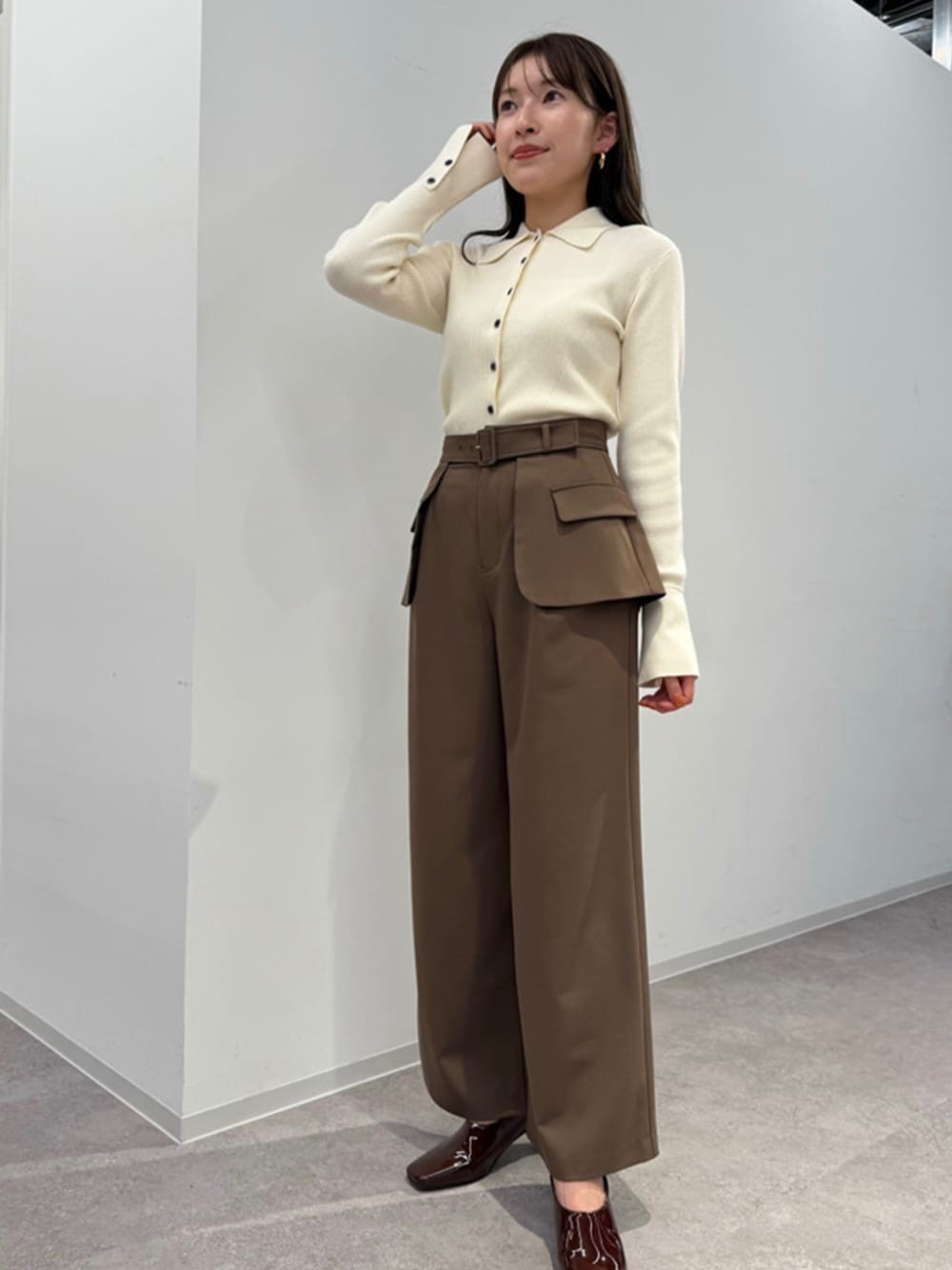 今季注目のレイヤーパンツに、ポロニットを合わせてトレンド感のあるスタイルに。 パンツはウエストベルトが取り外し可能なので、シンプルなパンツとしても使える便利な1着です◎ 袖先のフレアカフスや配色ボタンがアクセントになっているので、デニムパンツなどのシンプルボトムスに合わせるのもおすすめです。 ------------------------- 身長:160cm 【普段サイズ】トップス:M・ボトムス:M・シューズ:24.5 【着用サイズ】トップス:M・ボトムス:M・シューズ:24.5 -------------------------