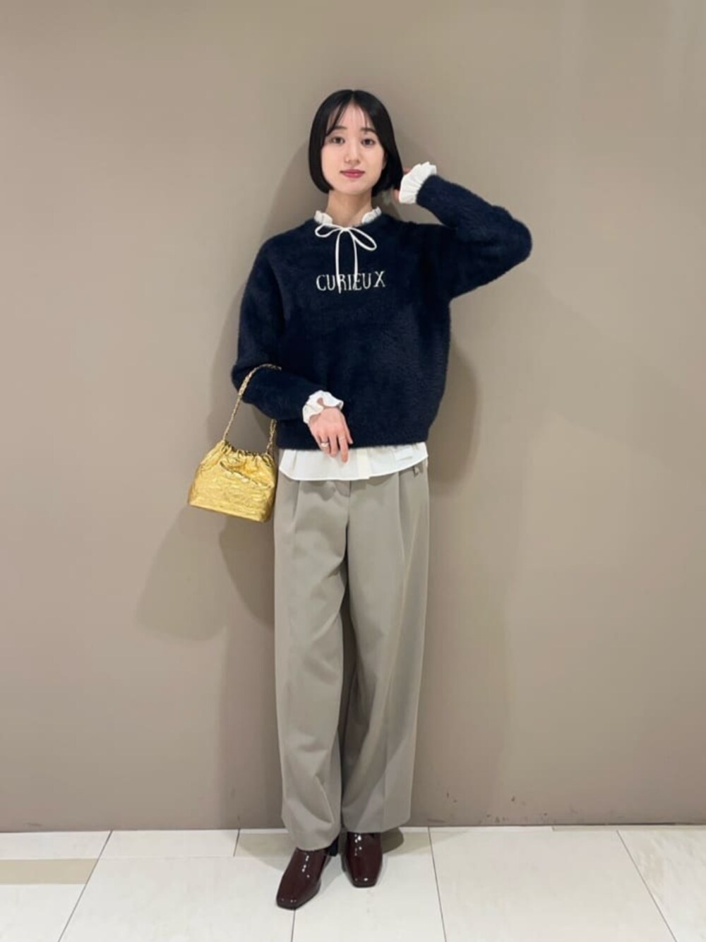 フェザーニットを主役にトラッドカジュアルコーデ☺︎ 《ニット》なんと言っても着心地が抜群なニットでずっと触っていたいくらい肌触りが良いです◎サイズ感はコンパクトにすっきり着れますが、ブラウスやハイネックインナーを中に入れる余裕はあります!ロゴもシンプルで大きすぎないので大人っぽい印象になりますよね! ------------------------- 身長:167cm 【普段サイズ】トップス:M・ボトムス:M・シューズ:24.5~25.0 【着用サイズ】トップス:M・ボトムス:M -------------------------