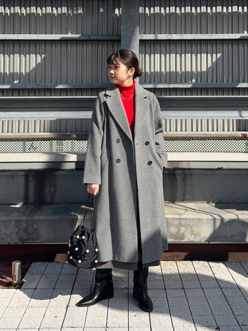 レッドを差し色にした冬の大人カジュアルコーデ♡コートは起毛感があり暖かみのある肌触りです。158cm、Mサイズ着用で脛辺りの丈です。身幅は程よくコンパクトにお作りしているので肩周りはスッキリしますが、ゆとりもあるので肉厚なトップスも窮屈感なく着れます。オーバーサイズが苦手な方やスッキリ着たい方にオススメです♪ ------------------------- 身長:158cm 【普段サイズ】トップス:M・ボトムス:M・アウター :M・シューズ:23.5 【着用サイズ】トップス:M・ボトムス:M・アウター :M・シューズ:23.5 -------------------------