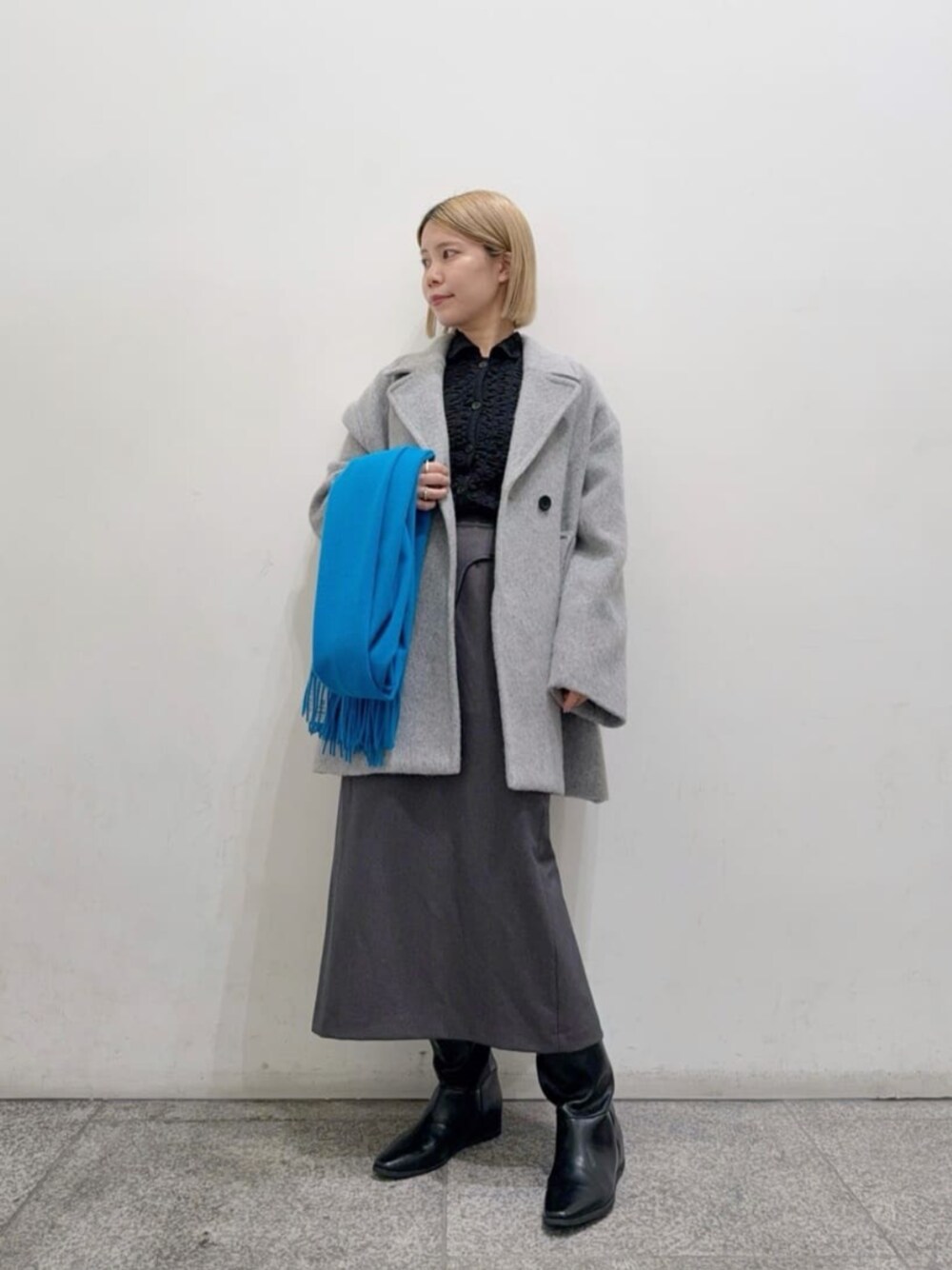 今年注目のミディコート!特にトレンドでグレーが人気です。(156cm、Mサイズ着用)Sでも十分ゆったりなサイズ感ですが、敢えてオーバーで着るのも、洒落感出そうです。スカートはウエストにコルセットが付いているので、気になるウエストをカバーできたのが嬉しいポイントでした。重く見えがちな冬、発色の良いマフラーなどでカラーを取り入れて頂くのもおすすめです。 ------------------------- 身長:156cm 【普段サイズ】トップス:M・ボトムス:M・アウタ:M 【着用サイズ】トップス:M・ボトムス:M・アウタ:M -------------------------