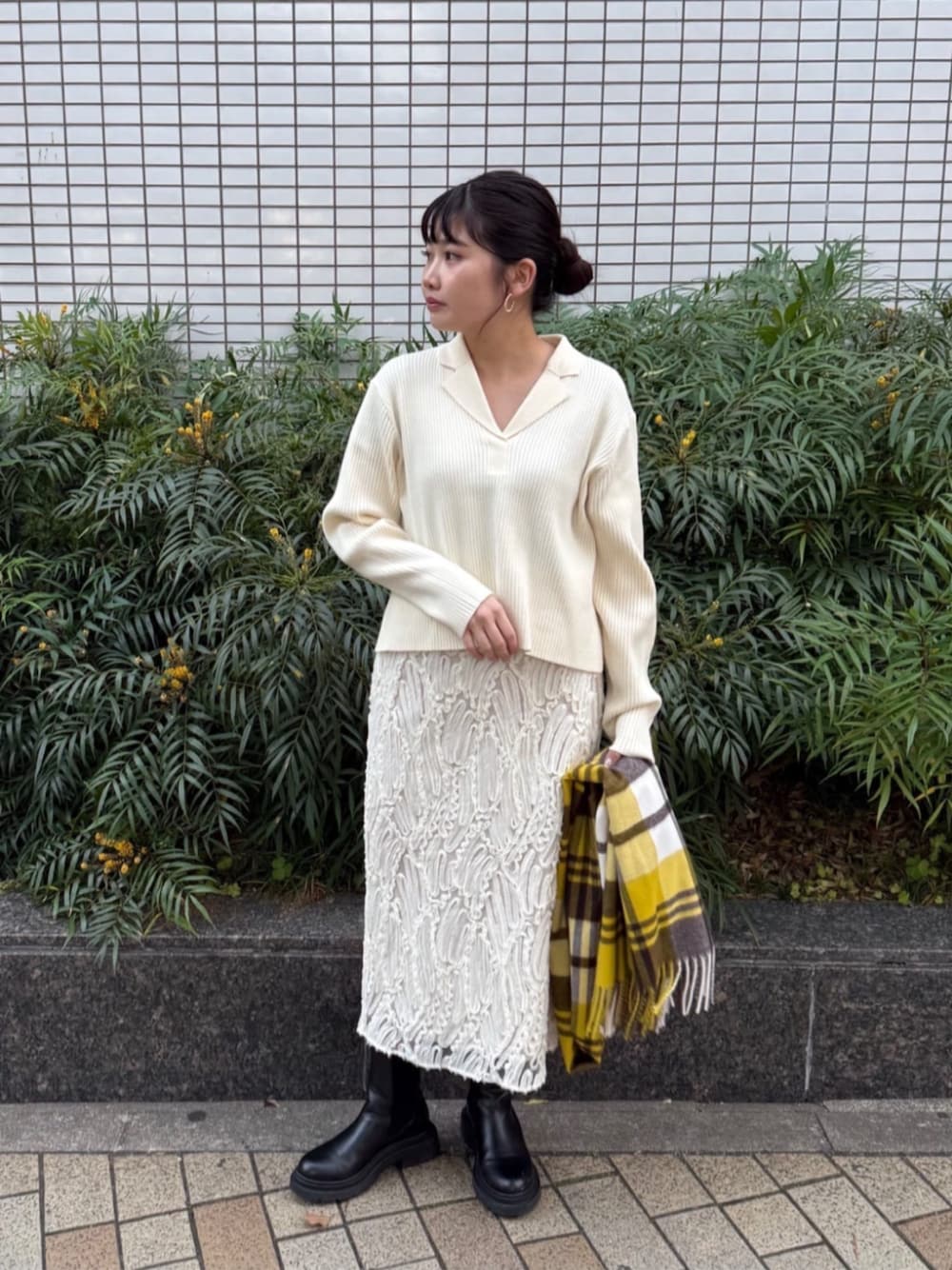 ニットは首元がスッキリ見える丁度良い空き具合で胸元が見える心配は無くお召し頂けます。サイドにスリットが入っていたり丈に前後差があるので自然と腰位置が上がり小柄な方でもバランスよくスッキリ着れます♩スカートはバックスリットが入っているので足さばきも良く歩きやすいです!裏地も長めに取っているので透け感は気にせず履けます。 ------------------------- 身長:158cm 【普段サイズ】トップス:M ・ボトムス:M ・シューズ:23.5 【着用サイズ】トップス:M ・ボトムス:S -------------------------