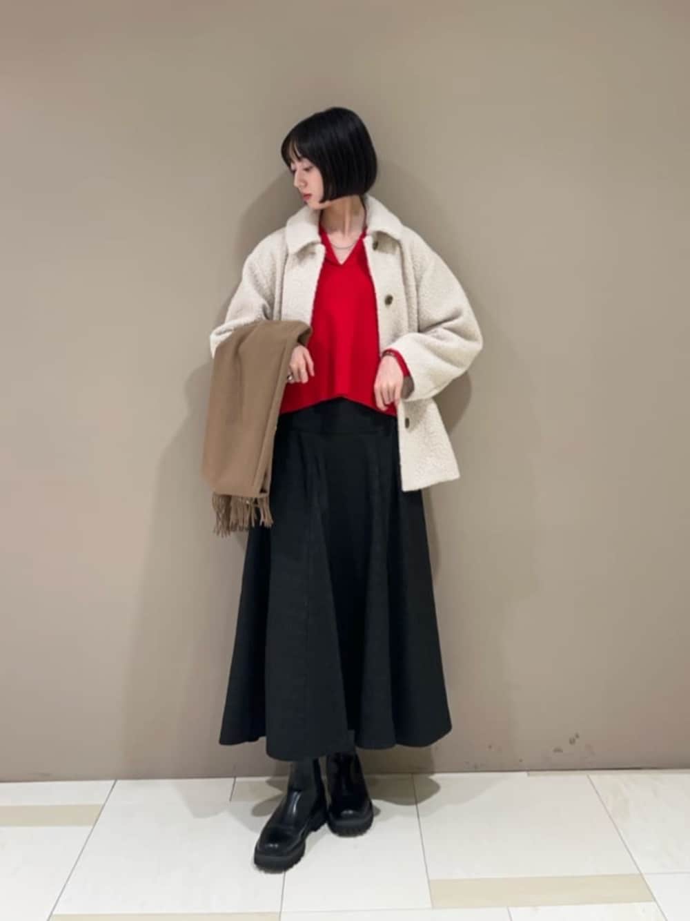 クリスマスに向けて赤を主役にしたデートコーデを組みました♡ ニットは開襟なので上からアウターを羽織っても顔周りがすっきりします。前後で着丈も少し違うのでボトムスインしなくても、もたつき気にならずにお召しいただけますよ♪ ------------------------- 身長:167cm 【普段サイズ】トップス:M・ボトムス:M・シューズ:24.5~25.0 【着用サイズ】トップス:M・ボトムス:M・アウター:M -------------------------