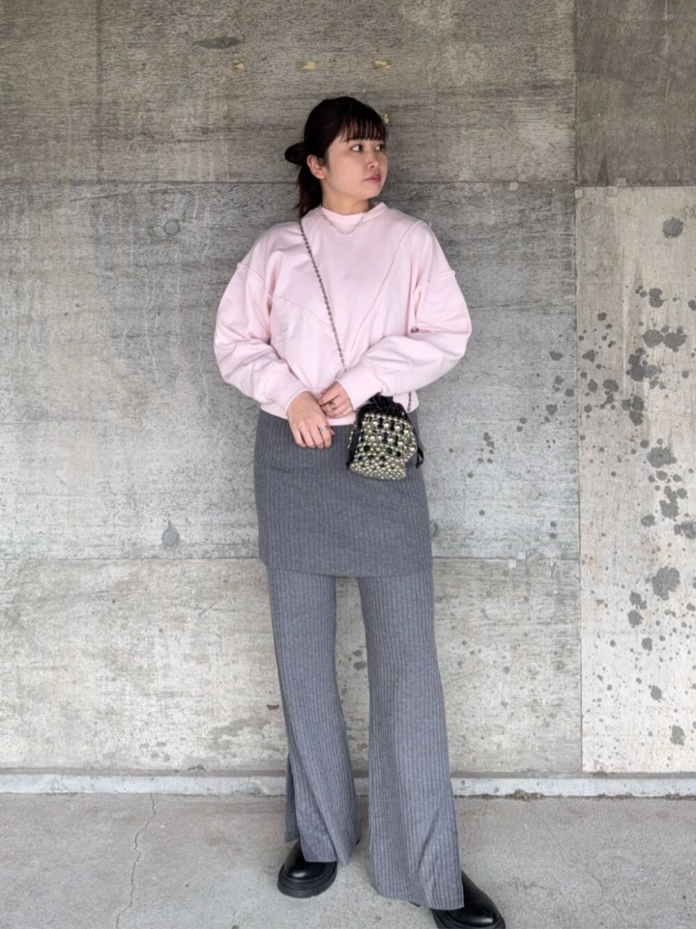 スウェットでもシンプルすぎずオシャレ見えする1枚です♡ボトムはスカートとパンツがレイヤードされた今年らしい1着です。ニット素材で伸縮性があり、ゆとりもあるので足のラインを拾わず着用できます。 ------------------------- 身長:158cm 【普段サイズ】トップス:M ・ボトムス:M ・シューズ:23.5 【着用サイズ】トップス:M ・ボトムス:M -------------------------