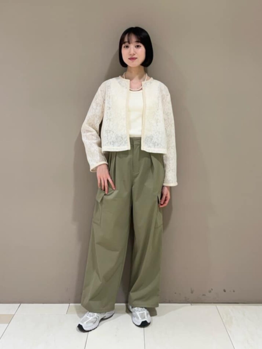 上品なレースブラウス×カーゴパンツでN.らしいミックススタイリングに。 ブラウスはこだわりのあるレース生地とフロントと袖口のテープのデザインが洗練された1枚です。羽織りとしても使えるように生地がしっかり作られています! ------------------------- 身長:167cm 【普段サイズ】 ・トップス:M ・ボトムス:M ・シューズ:24.5~25.0/ L 【着用サイズ】 ・トップス:M ・ボトムス:M -------------------------