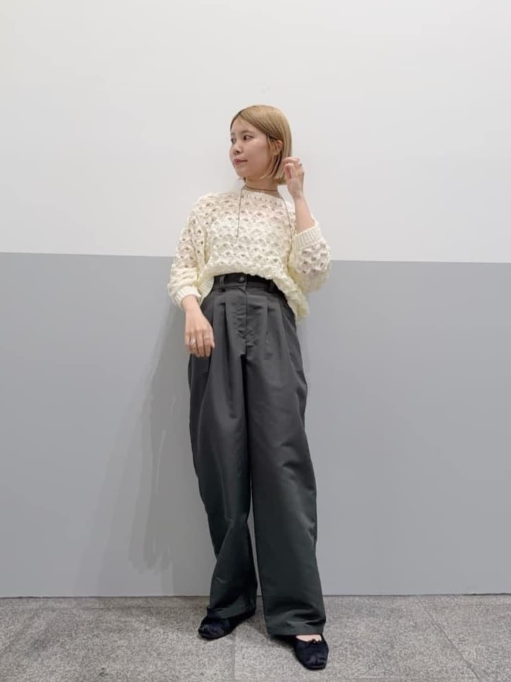 グレーのような、カーキのような魅力的なカラーのパンツをメインにスタイリングしました。トップスはトレンドの透かし編みで抜け感を出しました。足元も足の甲を見せ、抜け感をプラスしたところがポイントです。 ------------------------- 身長:156cm 【普段サイズ】 ・トップス:M ・ボトムス:M ・シューズ:23.5 【着用サイズ】 ・トップス:M ・ボトムス:M ・シューズ:23.5 -------------------------