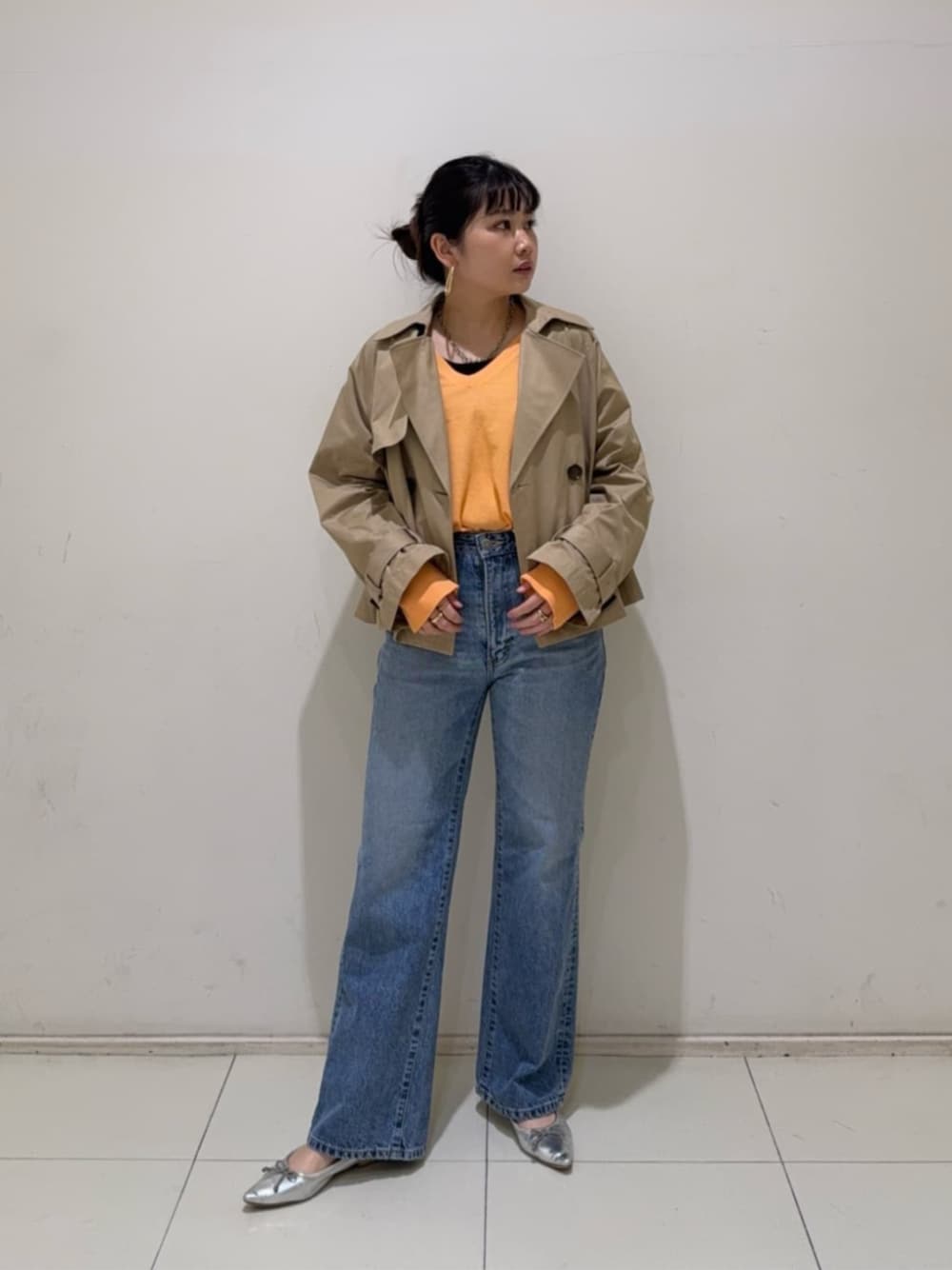 ショートトレンチコートは158cmでヒップが丁度隠れる丈です。身幅や袖周り等、全体的にゆとりがあるオーバーサイズのシルエットです!後ろもタックが入っているのでふわっと立体的に広がるシルエットが演出でき女性らしさもあります♡デニムはSOMETHING別注デニムで少し細身のフレアシルエットです。Mサイズ着用で丈もジャストでした! ------------------------- 身長:158cm 【普段サイズ】 ・トップス:M ・ボトムス:M ・アウター:M 【着用サイズ】 ・トップス:M ・ボトムス:M ・アウター:M -------------------------