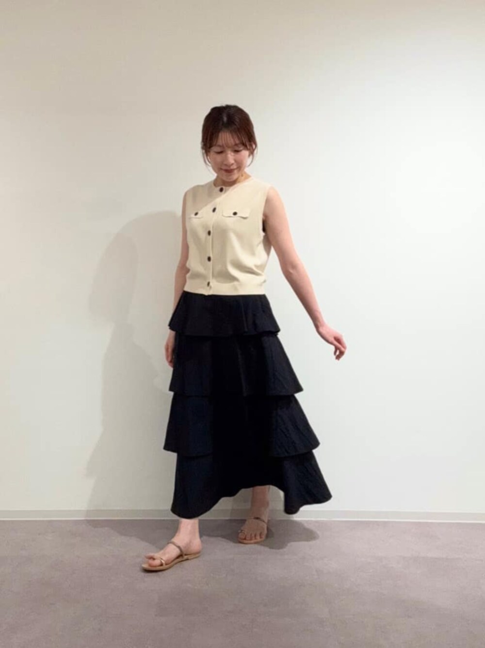配色ボタンがポイントのニットジレは、コンパクトなサイズ感なのでアウトでもバランスよく着ていただけます◎ ティアードデザインが華やかなスカートを合わせて、大人可愛いスタイルにしました。 スカートには、Tシャツとスニーカーを合わせたラフな着こなしもおすすめです! ------------------------- 身長:160cm 【普段サイズ】 ・トップス:M ・ボトムス:M ・シューズ:24.5./ L 【着用サイズ】 ・トップス:M ・ボトムス:M -------------------------