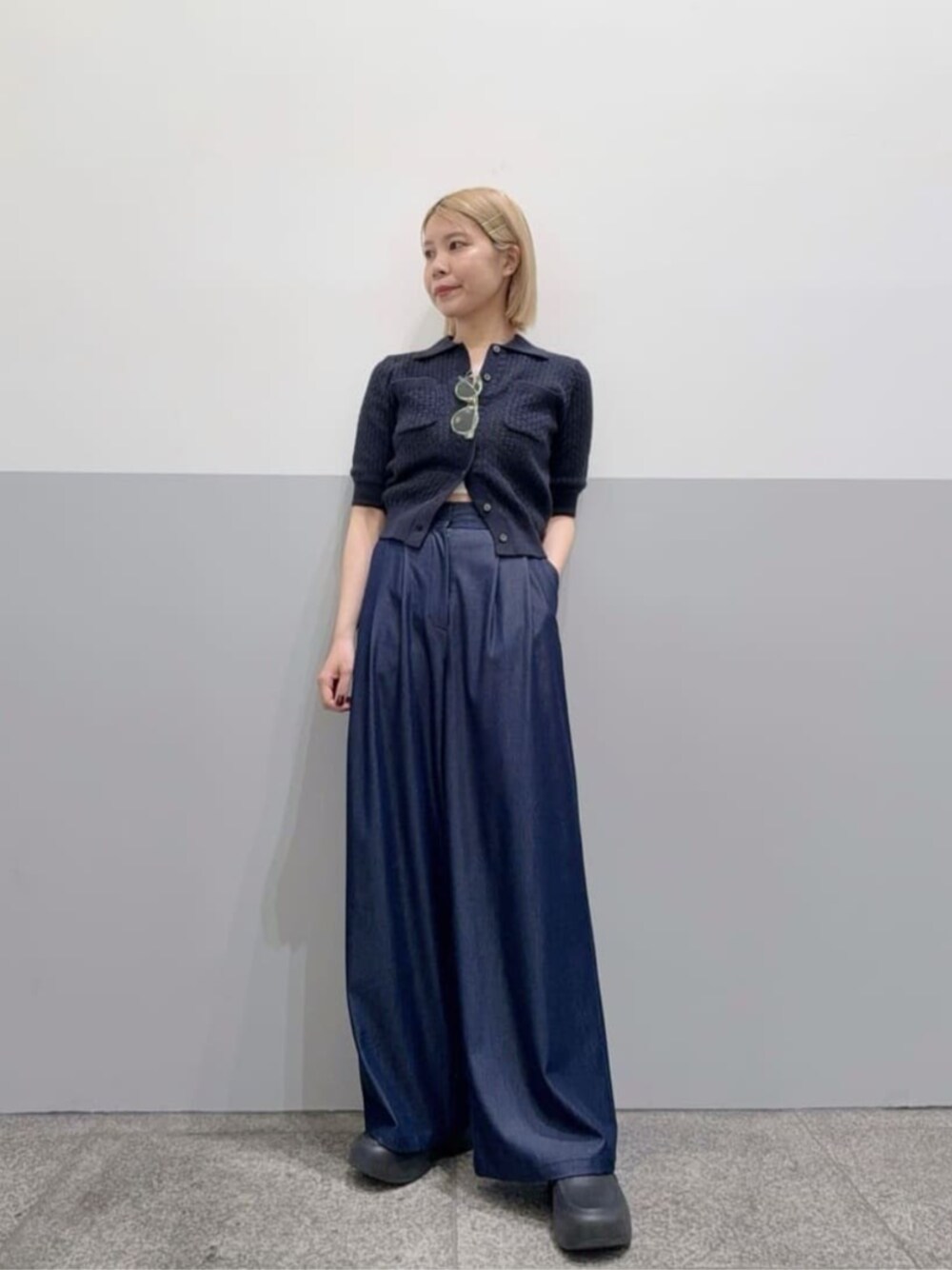 敢えてネイビー×ネイビーのワントーンでスタイリングを組みました。トレンドのポロニットは少し肌見せをすると、カジュアル感が抜けて大人見えします。ボトムスはデニム風の見た目ですが、肌触りはサラッとしていて、気温が上がるこれからの時期に快適に履いて頂けそうです。 ------------------------- 身長:156cm 【普段サイズ】 ・トップス:M ・ボトムス:M ・シューズ:23.0 【着用サイズ】 ・トップス:M ・ボトムス:M ・シューズ:23.0 -------------------------