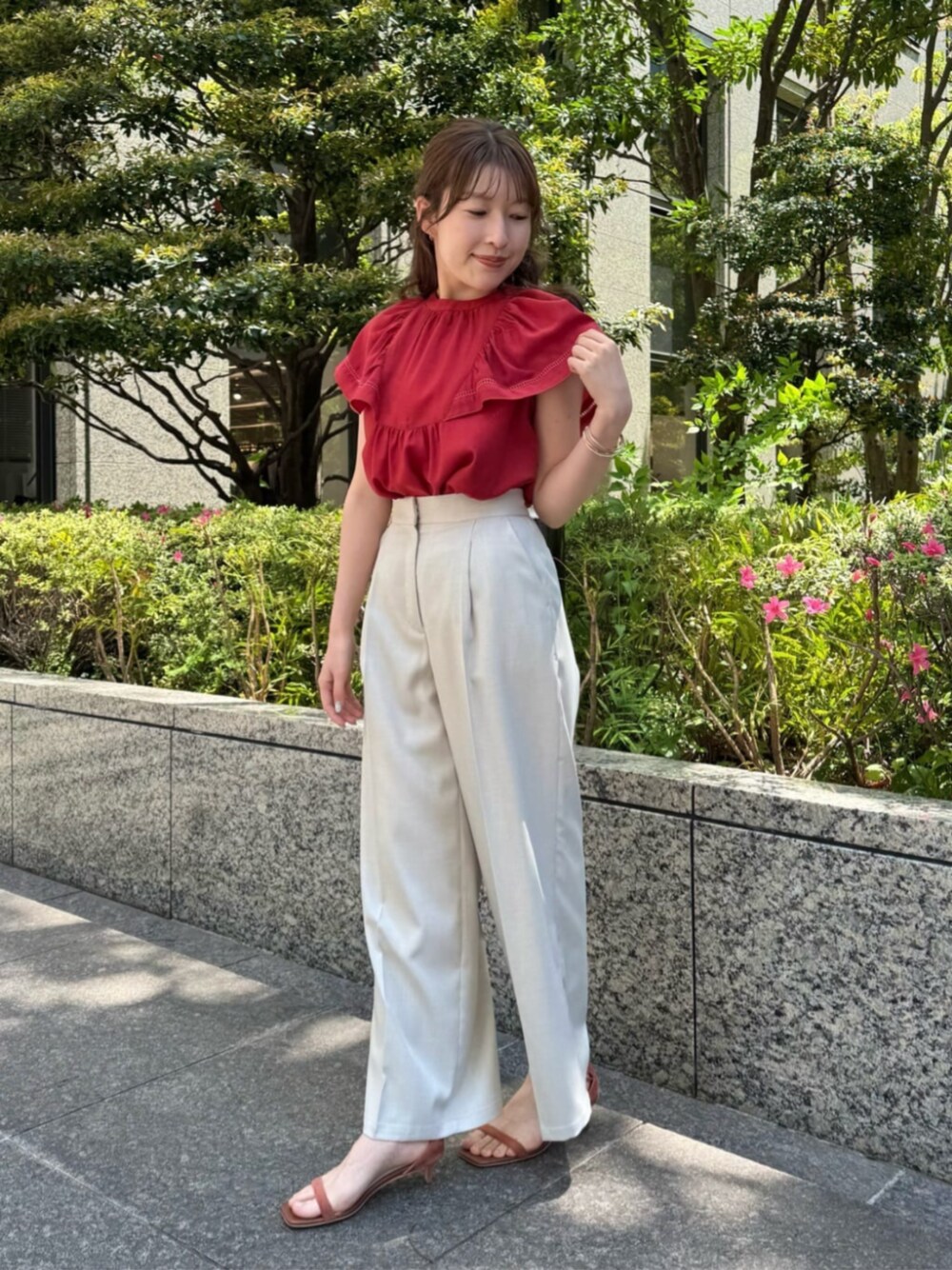 フレアスリーブブラウスに、メランジ調生地のタックパンツを合わせて女性らしいカジュアルスタイルにしました♩ ブラウスは、はしごレースがワンポイントになっておしゃれです◎ パンツはセンタープレス入りなので、スタイルアップ効果があるのも嬉しいポイントです! ------------------------- 身長:160cm 【普段サイズ】 ・トップス:M ・ボトムス:M ・シューズ:24.5./ L 【着用サイズ】 ・トップス:M ・ボトムス:M -------------------------