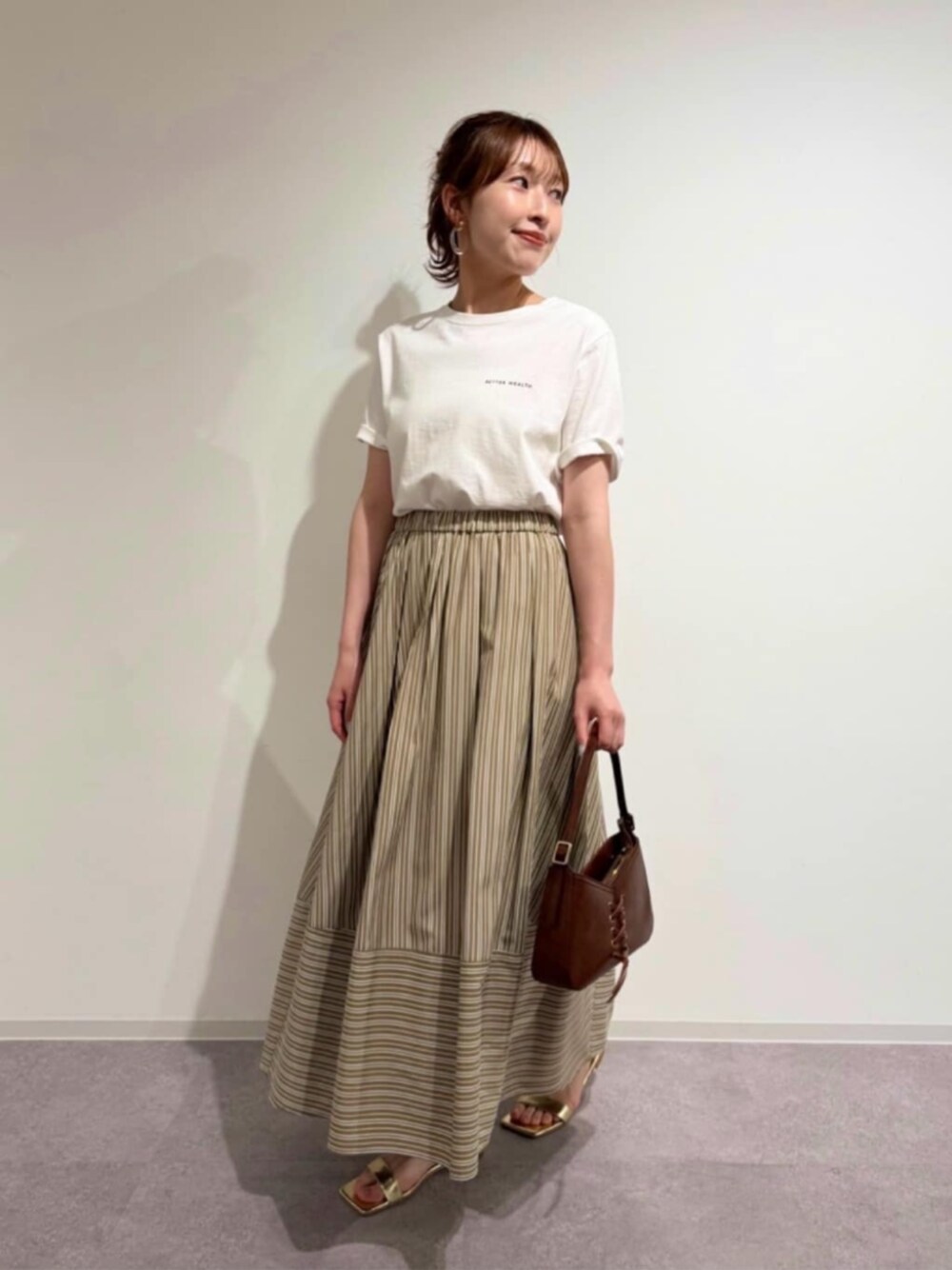 ストライプ柄が華やかなスカートに、Tシャツを合わせて女性らしいカジュアルスタイルにしました! スカートはハリ感のある生地なので、ふんわりと広がってラインが綺麗です♩ Tシャツはバックがハートプリントになっていて、後ろ姿までかわいいですよ♡ ------------------------- 身長:160cm 【普段サイズ】 ・トップス:M ・ボトムス:M ・シューズ:24.5./ L 【着用サイズ】 ・トップス:M ・ボトムス:M -------------------------