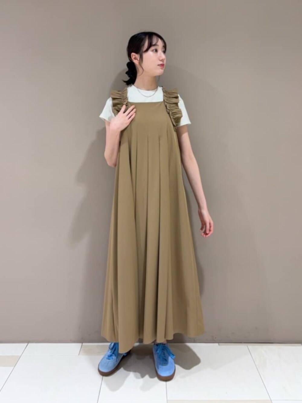 ラッフルデザインで後ろ姿が華やかになるワンピース。インナーなしでさらっと着ると旅行など特別なお出かけにもぴったりです♡ 今時期はTシャツやコンパクトニットをインナーに入れると着やすいですよ〜! ------------------------- 身長:167cm 【普段サイズ】 ・トップス:M ・ボトムス:M ・シューズ:24.5~25.0/ L 【着用サイズ】 ・トップス:M ・ワンピース:M -------------------------
