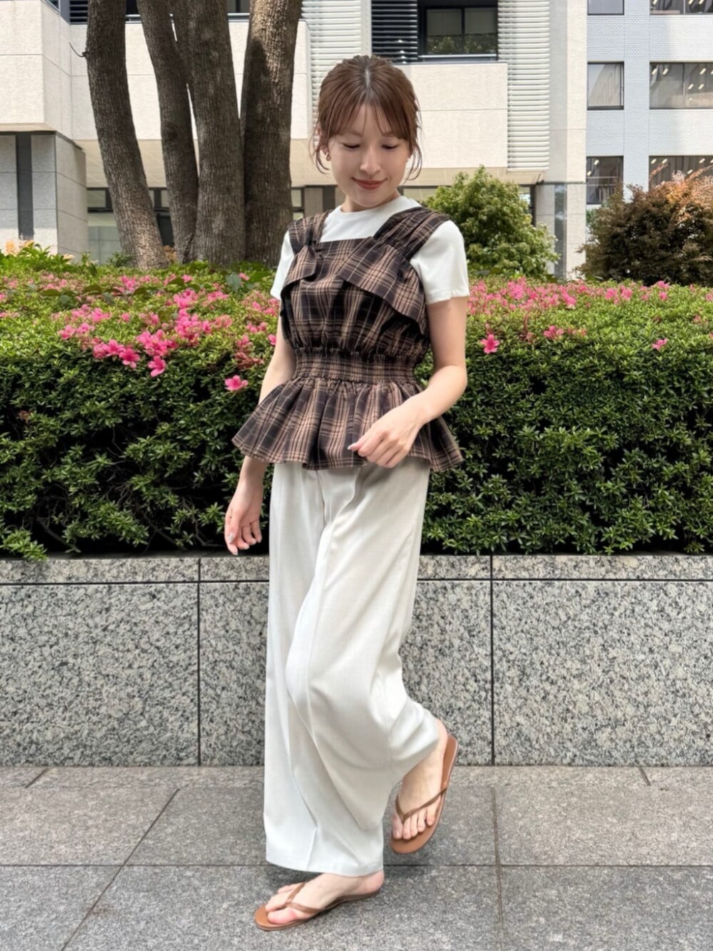 チェック柄のペプラムブラウスが主役の、大人かわいいカジュアルスタイル♩ 中に着たラメリブTは、さりげないラメ感なので柄物に合わせても素敵ですよ♡ ブラウスは他にも、デニムパンツに合わせてラフな着こなしもおすすめです◎ ------------------------- 身長:160cm 【普段サイズ】 ・トップス:M ・ボトムス:M ・シューズ:24.5./ L 【着用サイズ】 ・トップス:M ・ボトムス:M -------------------------