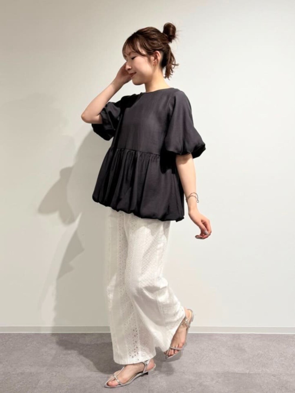 今季らしいシアー感のあるブラウスに、コットンレースのパンツを合わせて大人かわいいスタイルにしました♡ ブラウスの袖と裾がトレンドのバルーンデザインになっていて1枚で着映えしますね♩ パンツには、シンプルなTシャツなどを合わせたラフな着こなしも素敵です! ------------------------- 身長:160cm 【普段サイズ】 ・トップス:M ・ボトムス:M ・シューズ:24.5./ L 【着用サイズ】 ・トップス:M ・ボトムス:M -------------------------