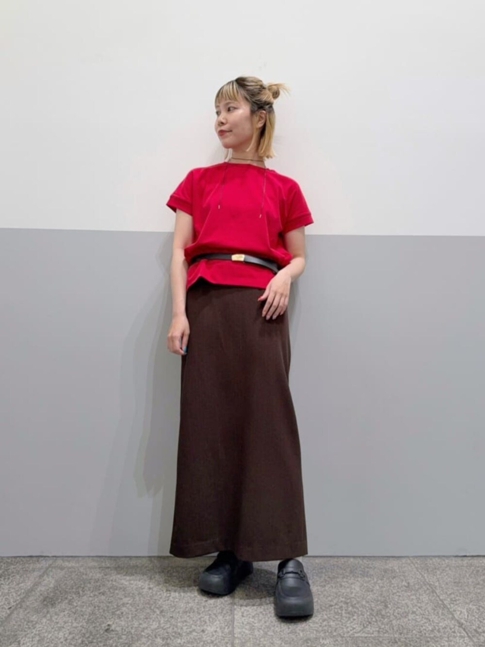 目を惹く赤色をメインにスタイリングしてみました。もちろんデニム合わせなどもかわいいのですが、ここは敢えてブラウンカラーで、パキッと感を出してみました。topsはシンプルなデザインなので、チョーカーやベルトなど小物で遊び心をプラスしスタイリングしてみました。 ------------------------- 身長:156cm 【普段サイズ】 ・トップス:M ・ボトムス:M ・シューズ:23.0 【着用サイズ】 ・トップス:M ・ボトムス:* M ・シューズ:23.0 -------------------------