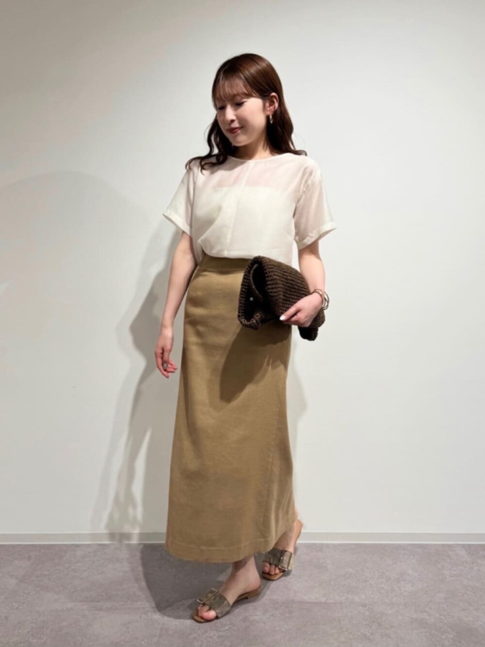 バックオープンブラウスは、後ろが開き過ぎない程よい肌見せなので、大人も着やすいですよ♩ タイトスカートを合わせて、シンプルにすっきりとまとめました! スカートは麻混なので、これからの暑い季節にピッタリですね◎ ------------------------- 身長:160cm 【普段サイズ】 ・トップス:M ・ボトムス:M ・シューズ:24.5./ L 【着用サイズ】 ・トップス:M ・ボトムス:M -------------------------