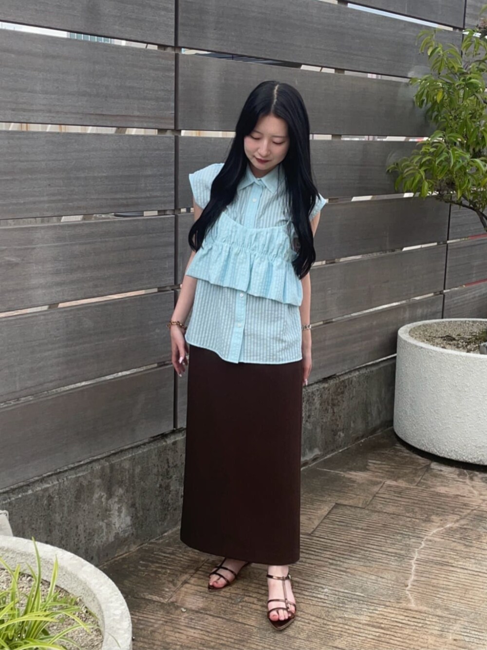 ビスチェとシャツの嬉しいセットアイテム⭐︎ ビスチェオンリーで着回しも♩ 夏らしい涼しげなカラー×トレンドカラーのブラウンでN.らしいコーデに!! シャツは程よく透け感があり抜け感を演出してくれます。 スカートは152cmでPSサイズを着地しており、くるぶし上の丈感です。 ------------------------- 身長:152cm 【普段サイズ】 ・トップス:M ・ボトムス:SorPS ・シューズ:23.0cm 【着用サイズ】 ・トップス:M ・ボトムス:PS -------------------------