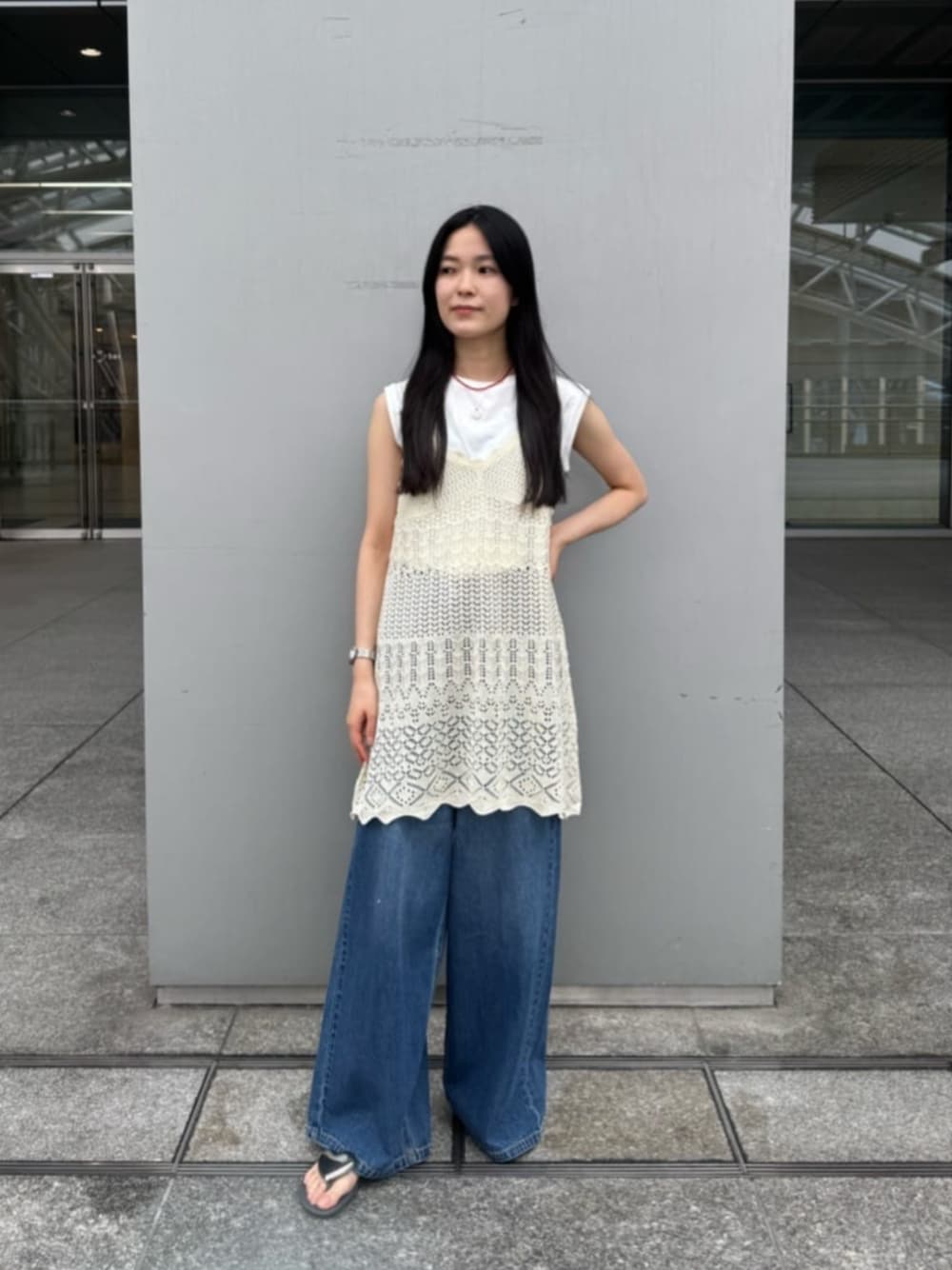 トレンド感あるレイヤードスタイルが完成するカギアミ風ニットビスチェ♪ ニットビスチェは素材も柔らかく軽くチュニック丈ですが重さも全く気にならないです! デニムもコットン素材で薄く柔らかい為、夏のお出かけにオススメです! ------------------------- 身長:159cm 【普段サイズ】 ・トップス:M ・ボトムス:M ・シューズ:23.0/M 【着用サイズ】 ・トップス:M ・デニム:M -------------------------