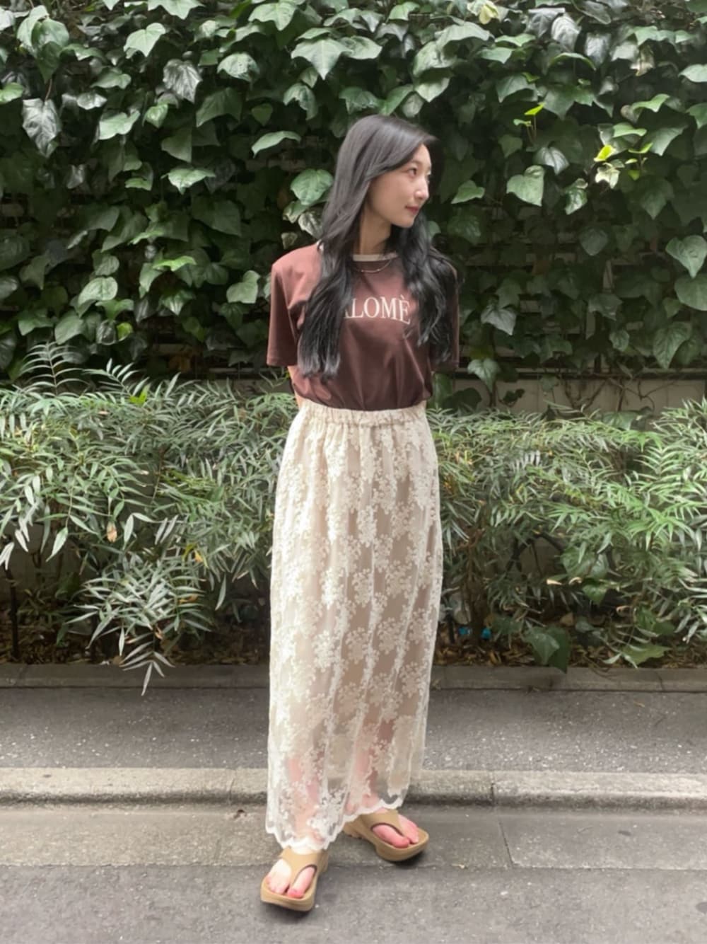 レーススカート×TシャツでN.らしいコーデに♪゛ レースが甘くなりすぎないデザインなので、女性らしさを引き出しつつ、日常に落とし込みやすいスカートです✦.* 裾の透け感が涼しげな印象を与えてくれます◎ Tシャツはニュアンスカラーでカジュアルすぎず、こなれ感を演出してくれる一枚!! キャミワンピースなどのインナーとして着るのもおすすめです🪄︎︎◝✩ 152cmでSサイズのスカート着用、厚手のシューズ合わせでかかと上ぐらいの丈感です。 ------------------------- 身長:152cm 【普段サイズ】 ・トップス:M ・ボトムス:SorPS ・シューズ:23cm 【着用サイズ】 ・トップス:M ・ボトムス:S -------------------------