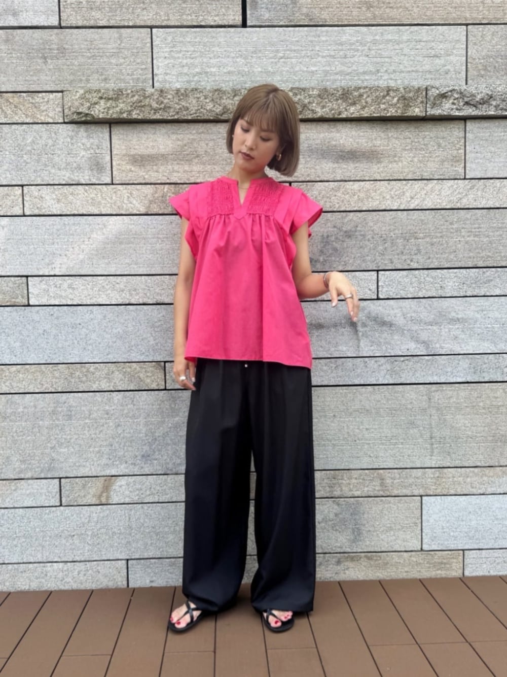 着映え効果抜群のコーディネートのご紹介です♡ピンクが目を引くブラウスは胸元のシャーリングや袖のフリルがポイント。着るだけで華やかになるのでボトムスはシンプルが◎ あえてリラックスなパンツでラフなコーデにするのも抜け感があって可愛いです。 ------------------------- 身長:162cm 【普段サイズ】 ・トップス:M ・ボトムス:M ・シューズ:23.5 【着用サイズ】 ・トップス:M ・ボトムス:M -------------------------