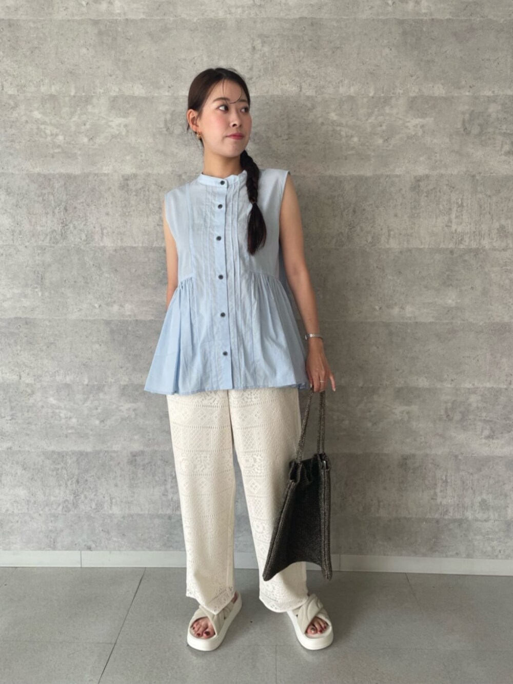 涼しさ、楽さ、オシャレさを兼ね備えたコーデ♩ ブラウスはほんのりシアー感があり、見えても良いインナーを入れて頂くのが安心です。 ペプラムのシルエットが綺麗で、着丈もヒップ下と気になるところをカバー。 レースパンツはウエストゴムで窮屈感無くお召し頂けます◎ ------------------------- 身長:156cm 【普段サイズ】 ・トップス:S/M ・ボトムス:S/M 【着用サイズ】 ・トップス:M ・ボトムス:M -------------------------