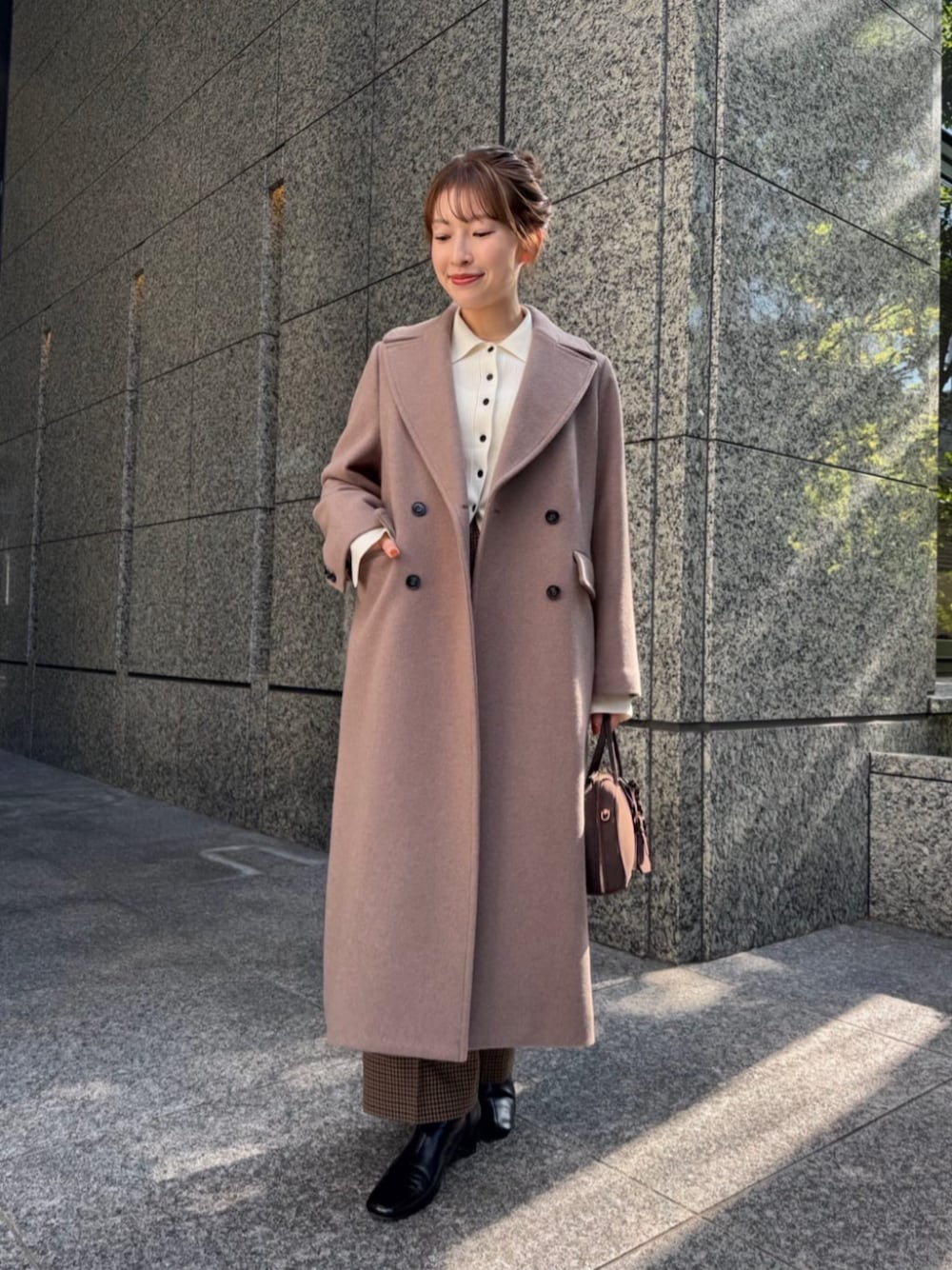 ウール100%で暖かいチェスターコートには、チェック柄のワイドトラウザーを合わせてスタイリッシュなスタイルに。 ロングコートなのに軽くて着やすいのも嬉しいポイントです♩ 他にもミニスカートやロングスカートなど、合わせるものを選ばず着ていただける1着あると便利なアウターです♡ ------------------------- 身長:160cm 【普段サイズ】 ・トップス:M ・ボトムス:M ・シューズ:24.5./ L 【着用サイズ】 ・アウター : M ・トップス:M ・ボトムス:M -------------------------