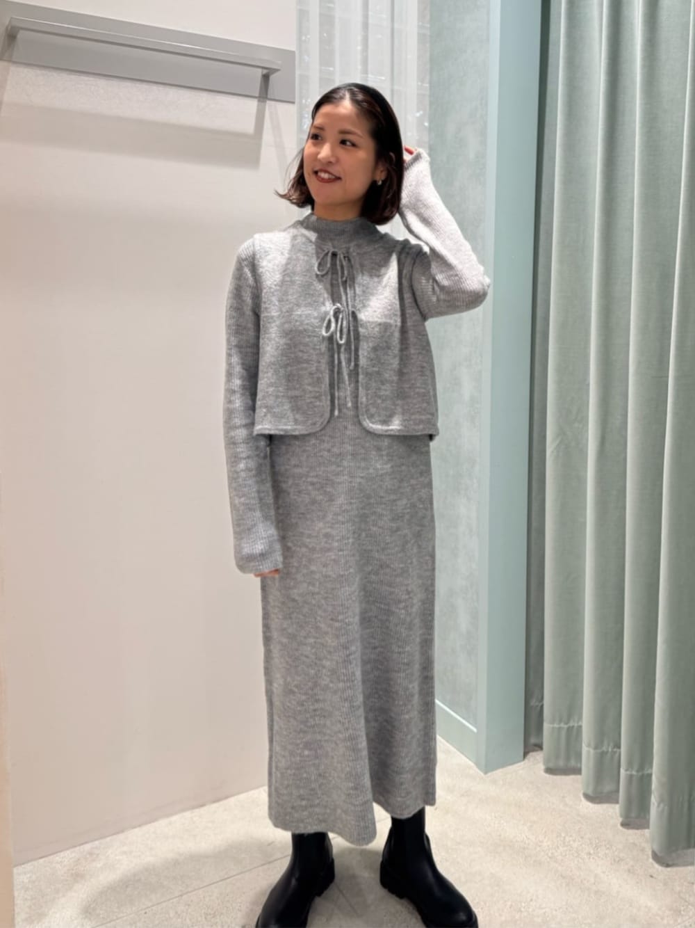 ダブルリボンが可愛いアンサンブルニットワンピース♡同素材のベストとワンピースのセットなので、レイヤードスタイルが苦手な方も挑戦しやすいです。カラーもグレーとネイビーのベーシックカラーの展開で単品でも着回し力抜群です♪ ------------------------- 身長:162cm 【普段サイズ】 ・トップス:M ・ボトムス:M ・ワンピース:M ・シューズ:23.5 【着用サイズ】 ・ワンピース:M ・シューズ:L