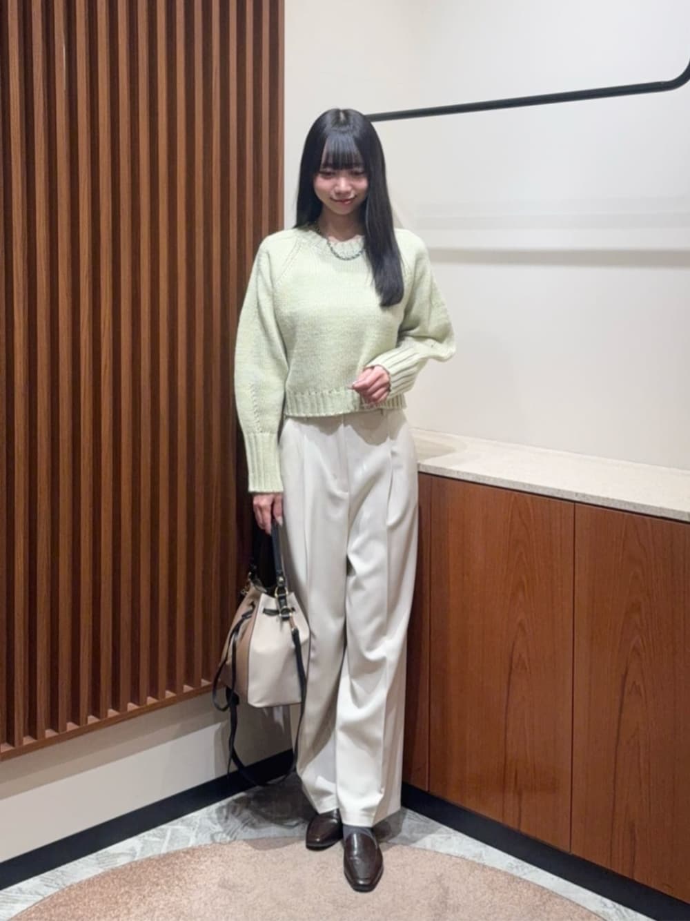 優しいグリーンカラーが可愛いニット♡ シャツをレイヤードした着こなしもおすすめです★.ᐟ 短丈ニットで脚長効果◎!! 落ち感がありスッキリとしたシルエットのパンツと合わせることで、美脚効果も抜群でスタイルアップが叶います♪ どちらも今から春先まで使える生地感で、ロングシーズン活躍するアイテムです⋆˙⟡ ------------------------- 身長:167cm 【普段サイズ】 ・トップス:M ・ボトムス:M ・シューズ:23.5/M 【着用サイズ】 ・トップス:M ・ボトムス:S ・シューズ:M