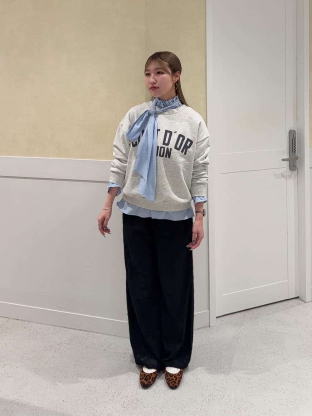 存在感たっぷりの新作ブラウス🩵 リボン結びも可愛いですが、片リボンにアレンジしてこなれ感をプラスしました♩ パンツはゆるっとしたシルエットで楽ちん! フェザーなので合わせるだけでグッとオシャレに見えます💫 ------------------------- 身長:158cm 【普段サイズ】 ・トップス:S/M ・ボトムス:M ・シューズ:23.5/M 【着用サイズ】 ・ブラウス:S ・スウェット:M ・ボトムス:M ・シューズ:M