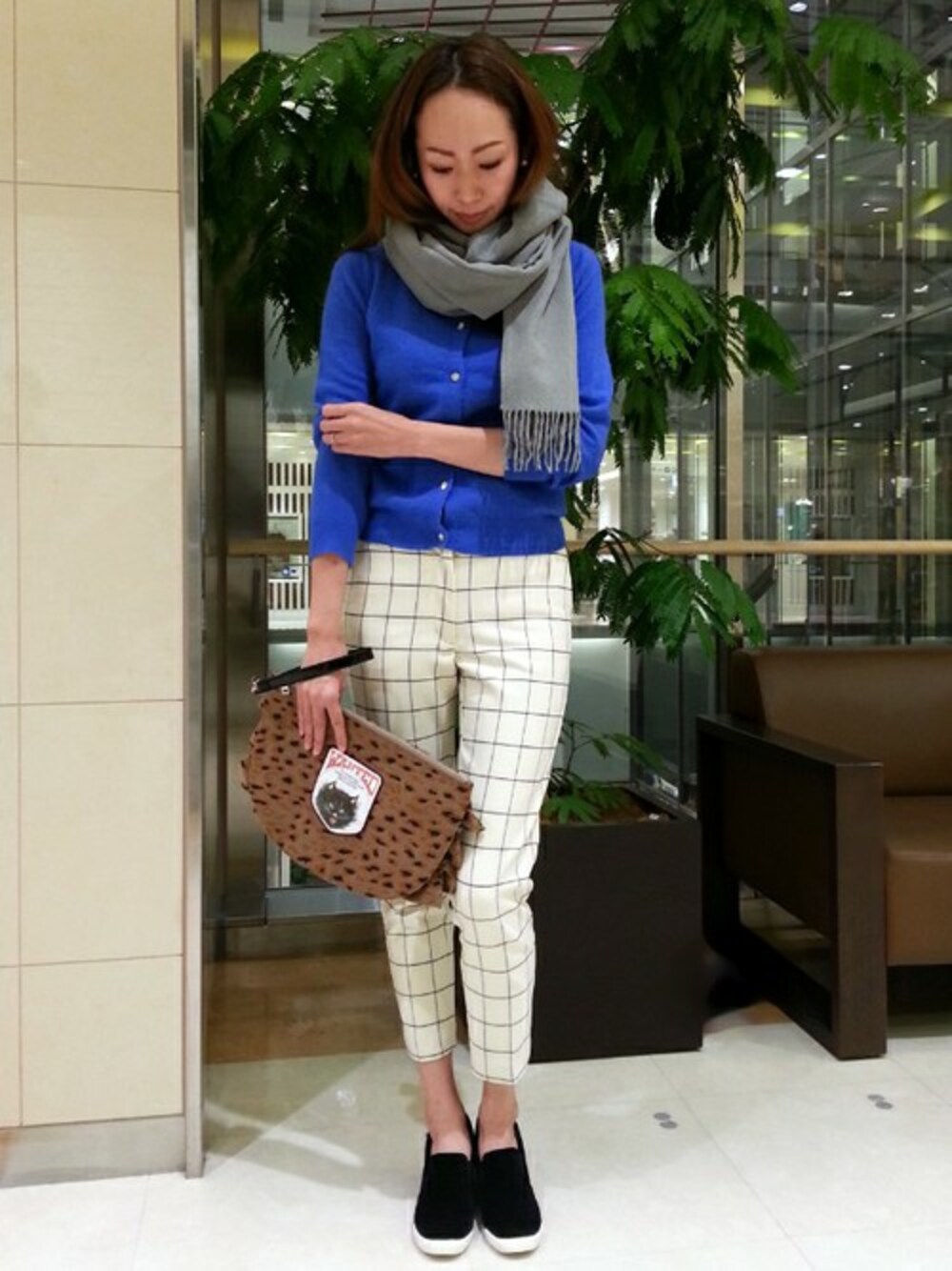 チェックパンツにキレイ色カーデを合わせてマニッシュに。 レオパード柄のクラッチバッグはちょっとした遊び心♪