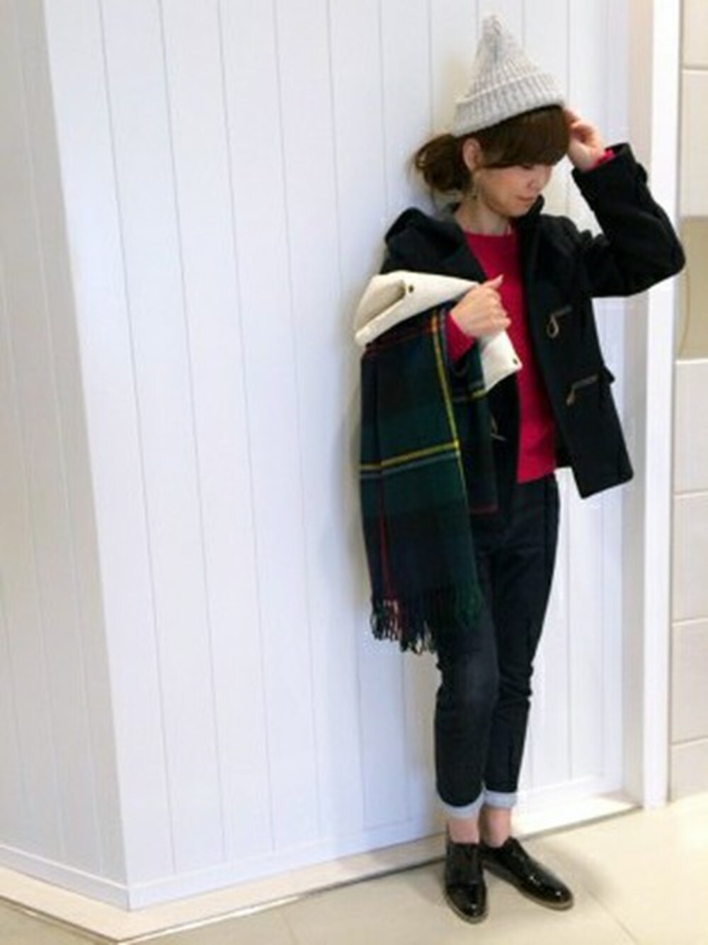 ショートダッフルコートにチェックストールを合わせてクリスマス気分を盛り上げて♪ニット帽で防寒もばっちり★