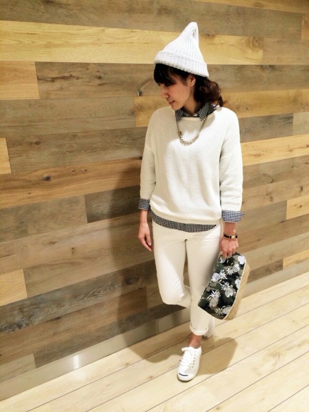 春らしいギンガムチェックシャツをアクセントに、ホワイトコーデを新鮮にフレッシュアップ★