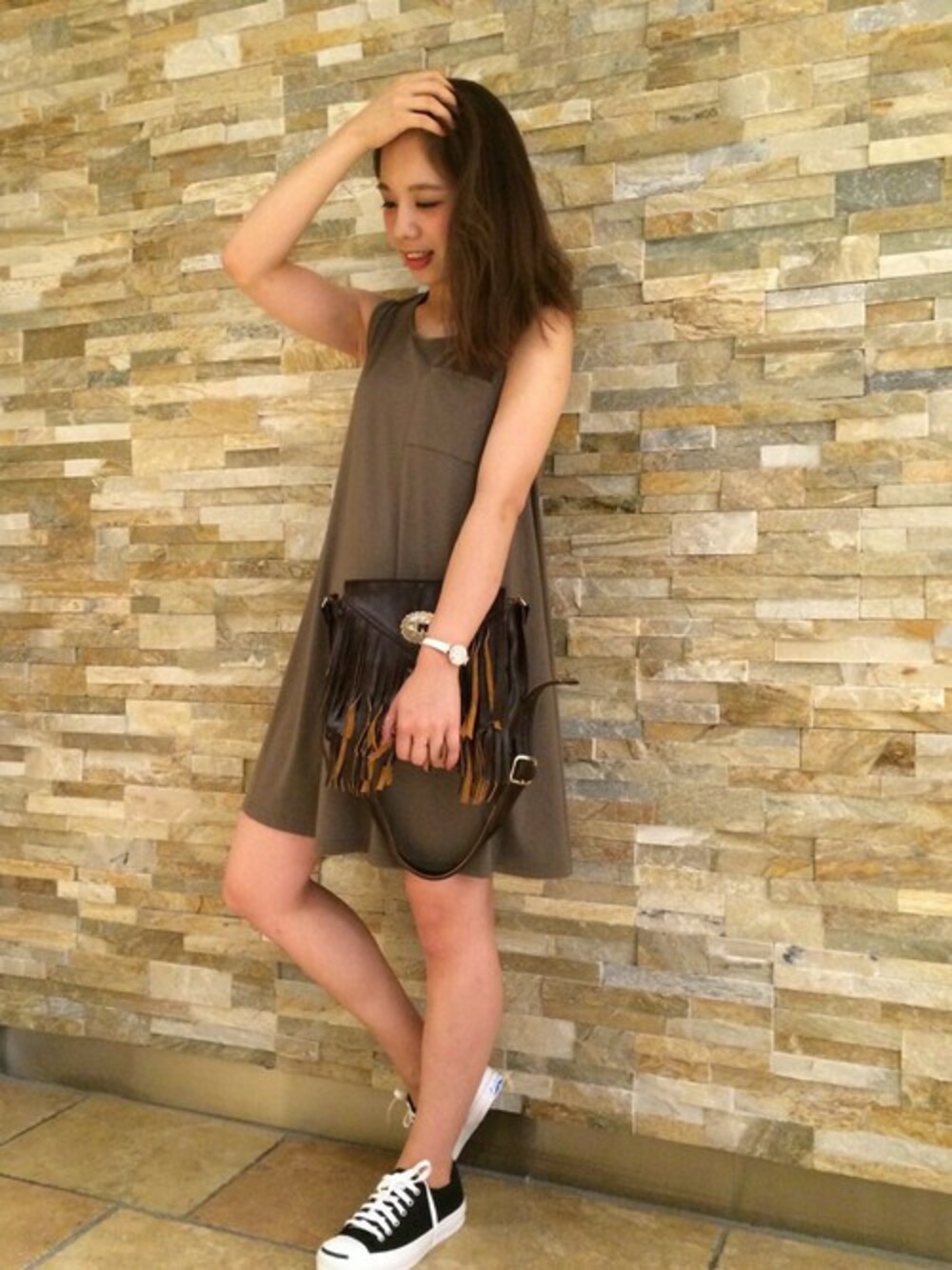 楽ちんカットソーワンピをさらりと着こなして♪ 小物は今年らしくフリンジのBAGでアクセントをプラス!!