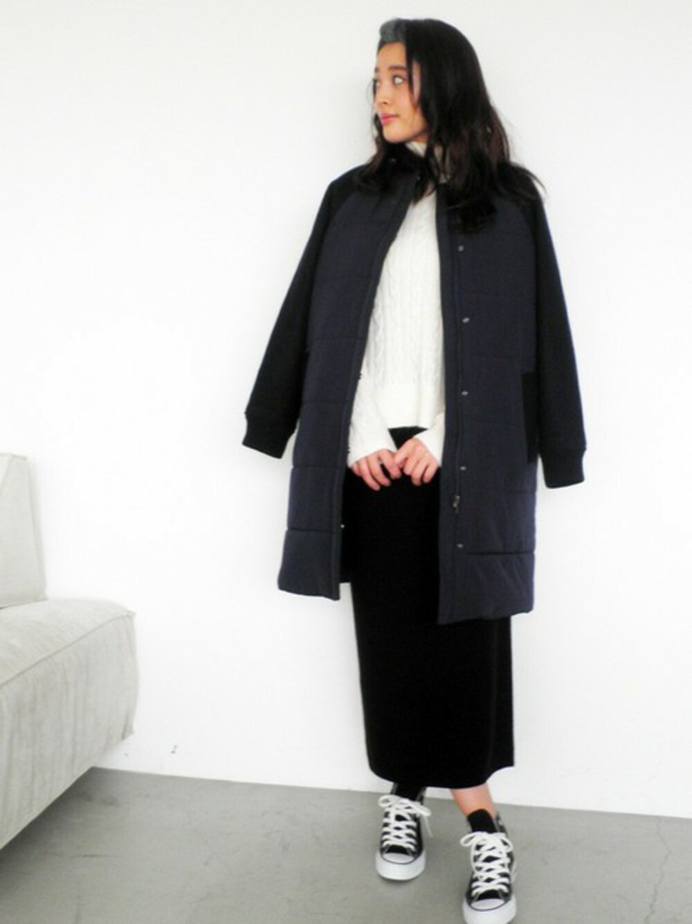 ブルゾンのようなロングコートでトレンド感をプラス! モノトーンでまとめて大人カジュアルに♪