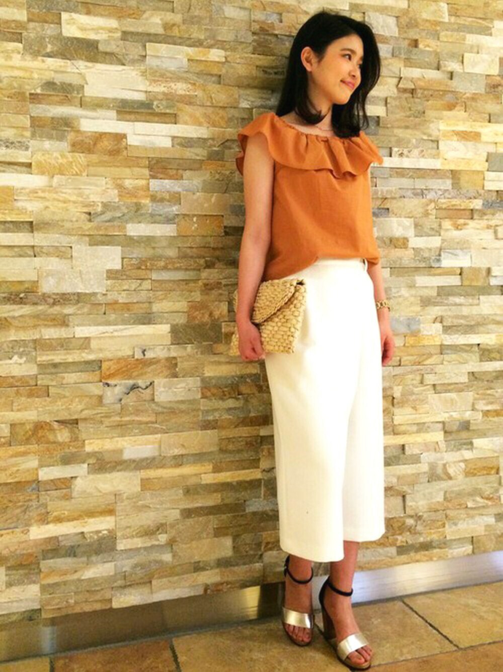 女っぽさ十分♪なフリルブラウスもオレンジなら甘さ控えめ。大人感を演出してくれます。