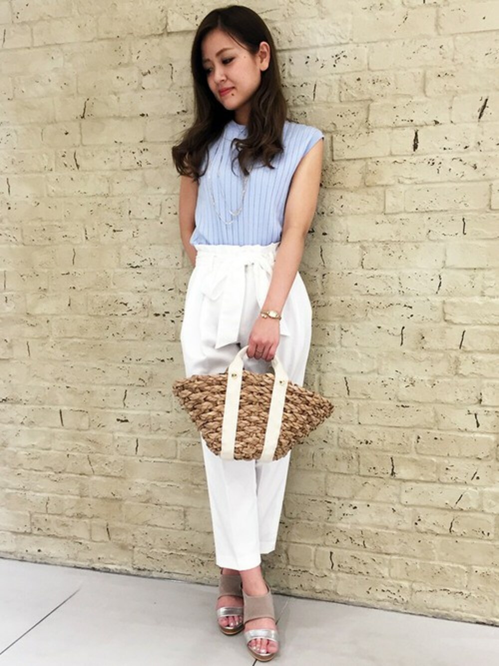 爽やかなブルーを差し色に、ホワイトで統一したコーデ♪ イージーパンツはウエストがゴムで履き心地も抜群です! ハイウエストでスタイルアップも☆