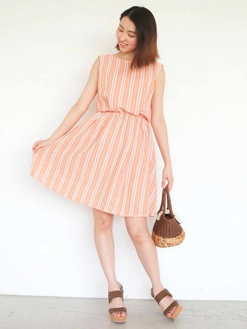 SNS企画でも掲載しているストライプワンピース! オレンジの明るめカラーとふんわり広がるスカートが 可愛らしさを引き出します♪