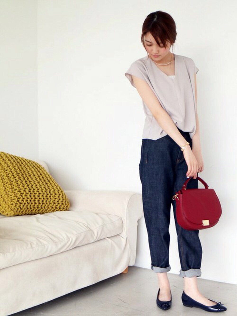 かっちりブラウスをデニムで合わせて オトナカジュアルに♪ ボルドーを差し色に女性らしく♪