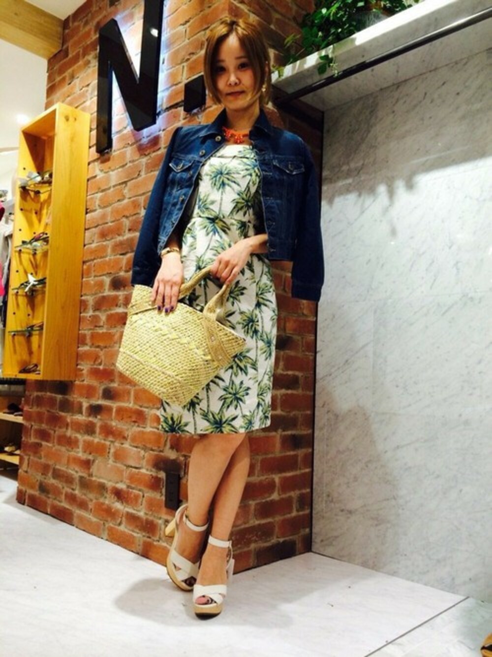 ヤシの木柄の膝丈デザインで大人っぽくお召し頂けるワンピースに、Gジャンを合わせたタウンユースのリゾートスタイルです!