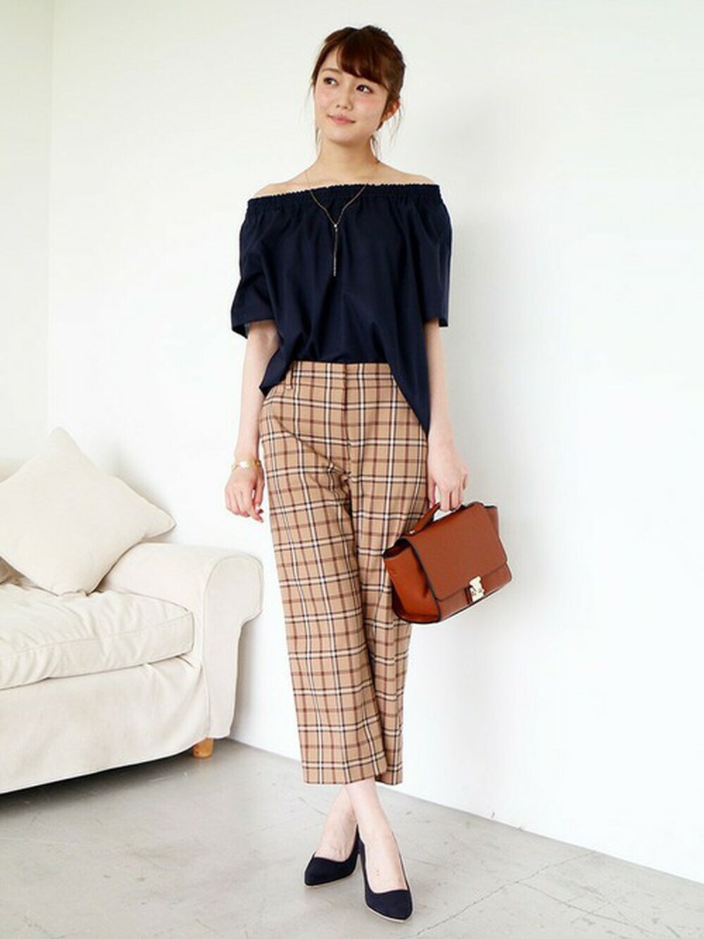 以前ご紹介したチェックパンツの色違いをコーディネート♪ オフショルやヒールで合わせて、女性らしく!