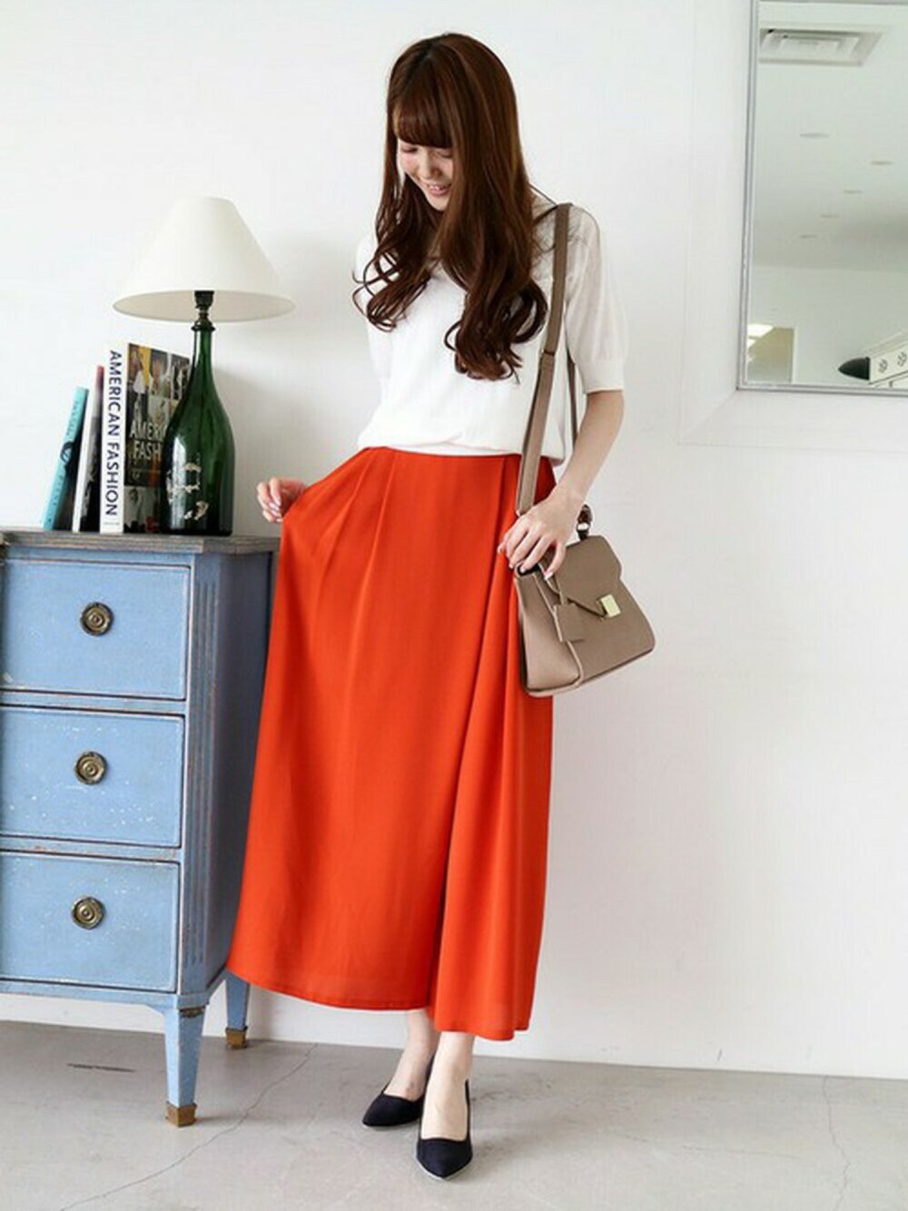 鮮やかなオレンジが目を引くボトムは、ほかのアイテムは控えめに♪ スカート見えするパンツで女性らしく!