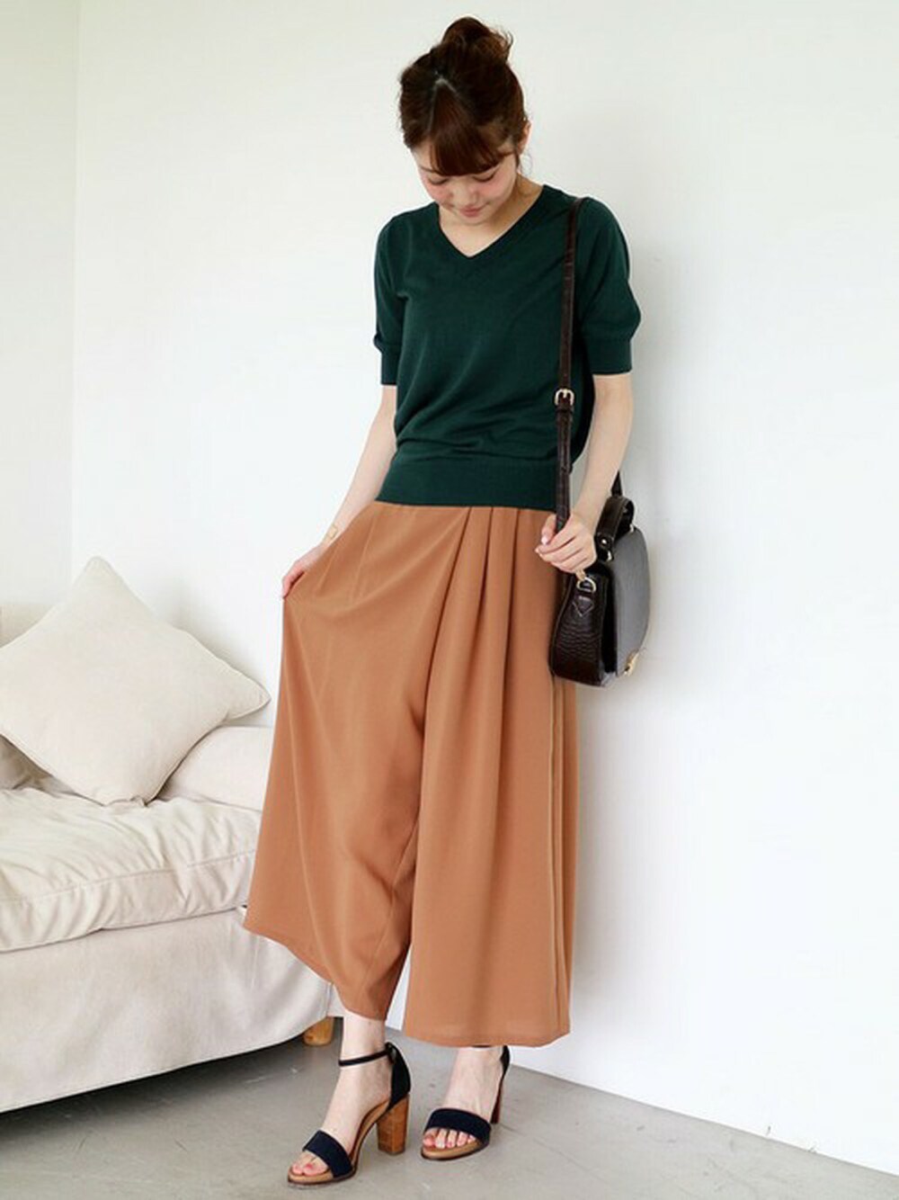 深めのグリーンは、大人っぽく優しい印象に。 秋を意識した先取りコーデ★