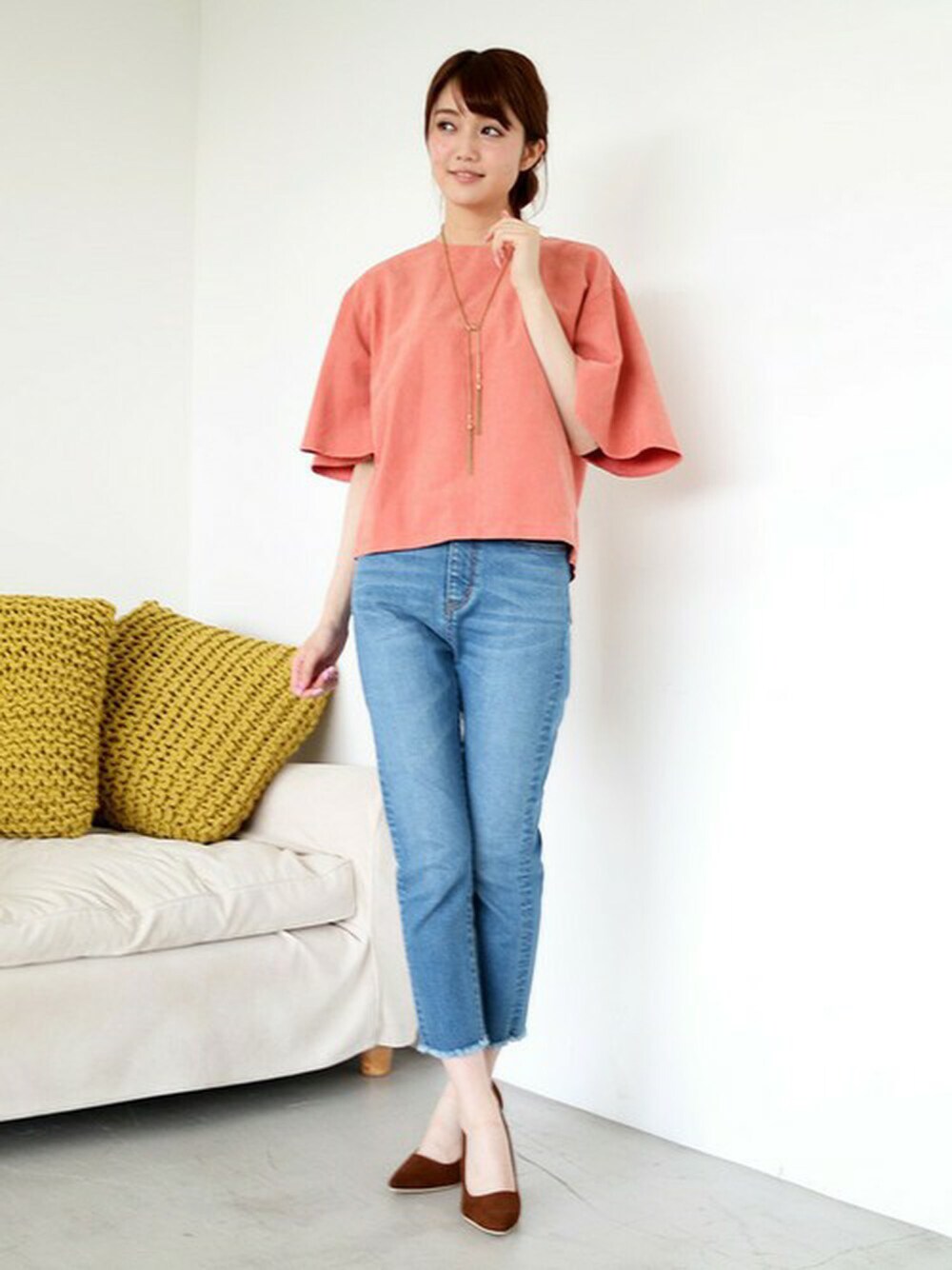 ピーチ素材で秋を先取り! シンプルなコーデでも袖がフレアで寂しくない♪