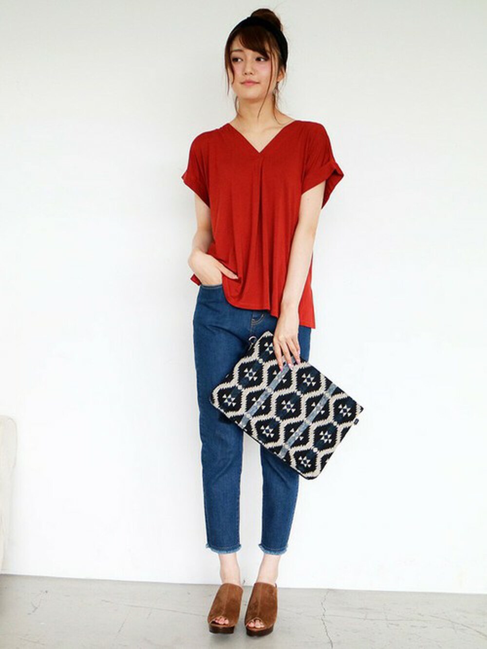 鮮やかなレッドが目を引くカットソーは袖をまっくった様なデザインと 胸元のタックで裾広がりになる女性らしいトップス。 柄物BAGでコーデにワンポイントを♪